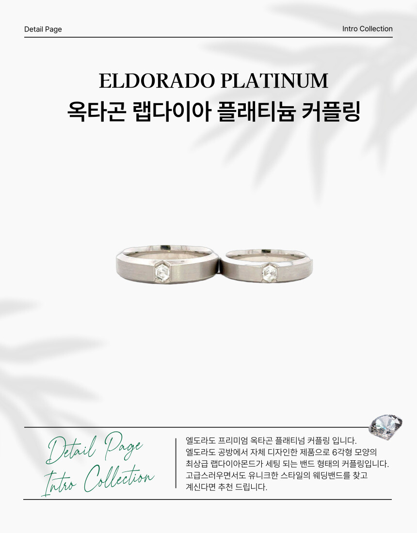 엘도라도 프리미엄 옥타곤 플래티넘 커플링 입니다. 엘도라도 공방에서 자체 디자인한 제품으로 6각형 모양의 최상급 랩다이아몬드가 세팅 되는 밴드 형태의 커플링입니다. 고급스러우면서도 유니크한 스타일의 웨딩밴드를 찾고 계신다면 추천드립니다.