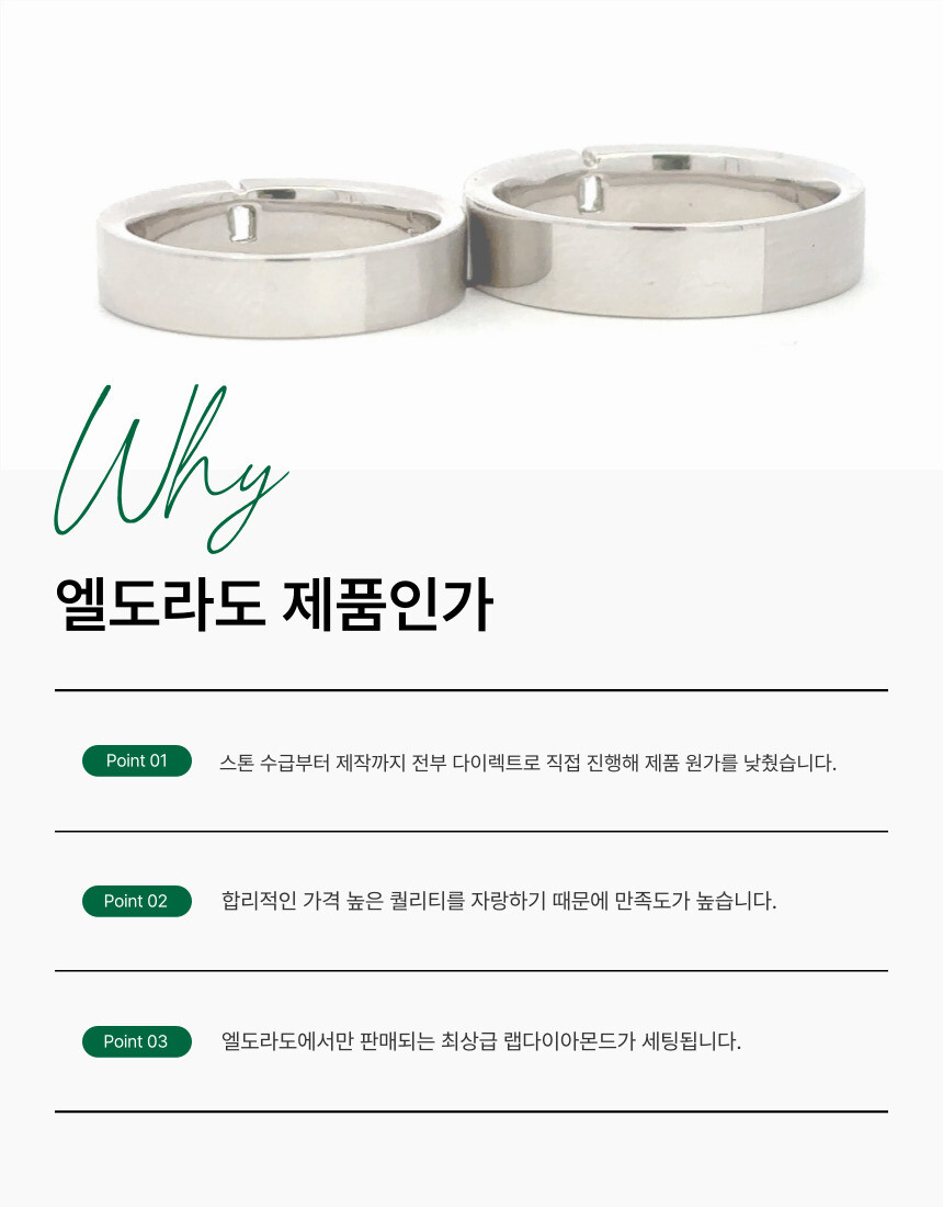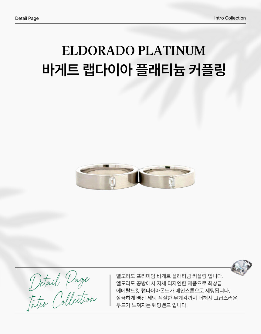 엘도라도 프리미엄 바게트 플래티넘 커플링 입니다. 엘도라도 공방에서 자체 디자인한 제품으로 최상급 에메랄드컷 랩다이아몬드가 메인 스톤으로 세팅됩니다. 깔끔하게 빠진 세팅 적절한 무게감까지 더해져 고급스러운 무드가 느껴지는 웨딩밴드 입니다.