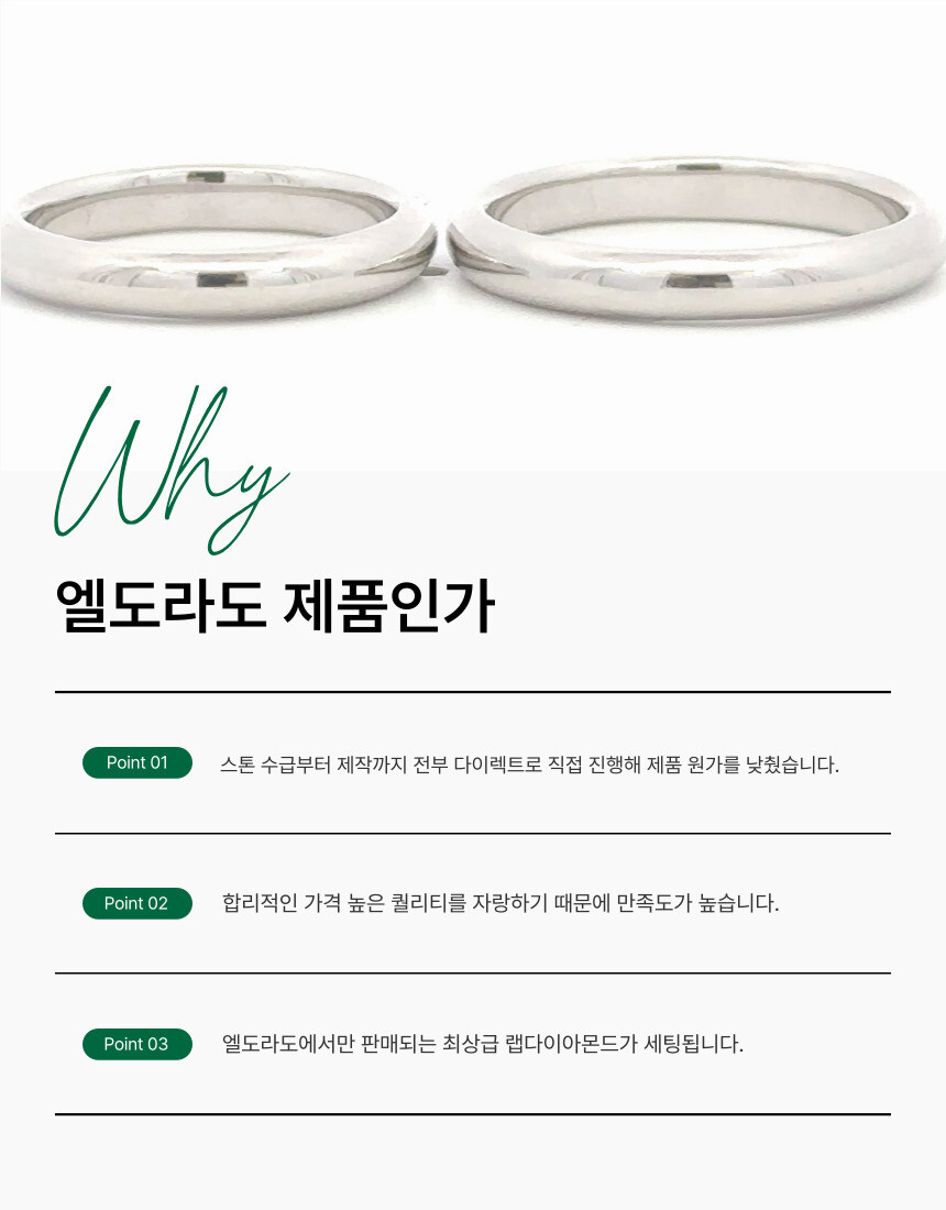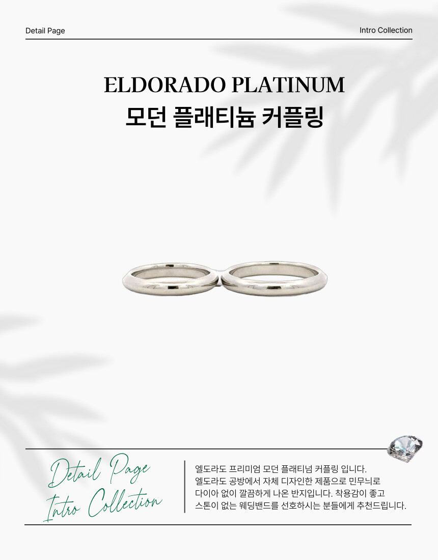 엘도라도 프리미엄 모던 플래티넘 커플링 입니다. 엘도라도 공방에서 자체 디자인한 제품으로 민무늬로 다이아 없이 깔끔하게 나온 반지입니다. 착용감이 좋고 스톤이 없는 웨딩밴드를 선호하시는 분들에게 추천 드립니다.
