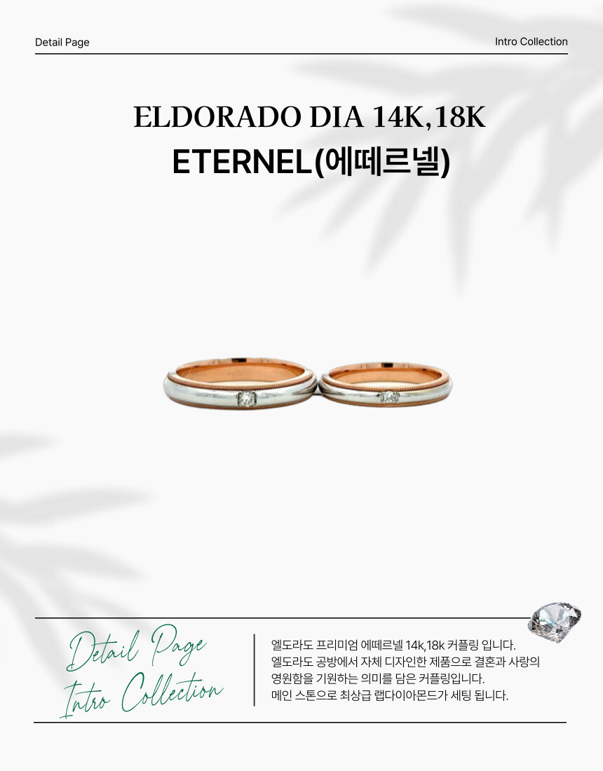엘도라도 프리미엄 에떼르넬 14k,18k 커플링입니다. 엘도라도 공방에서 자체 디자인한 제품으로 결혼과 사랑의 영원함을 기원하는 의미를 담은 커플링입니다. 메인 스톤으로 최상급 랩다이아몬드가 세팅됩니다.