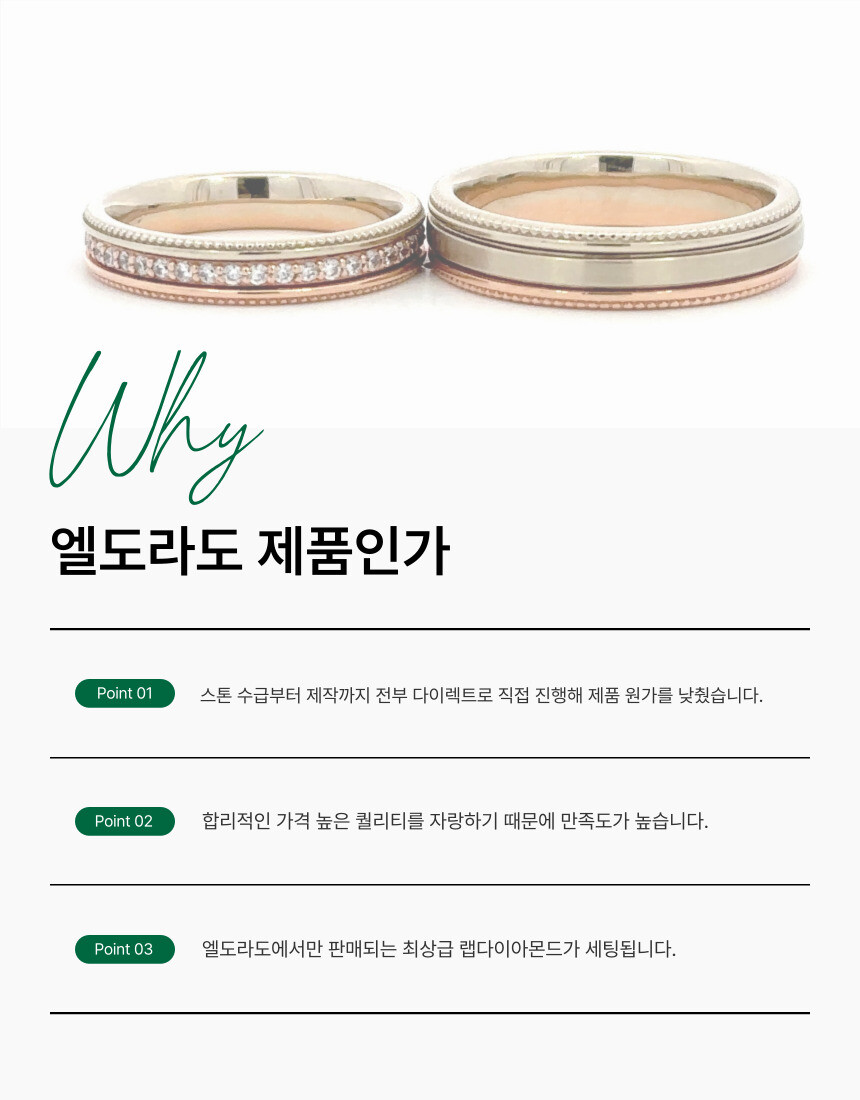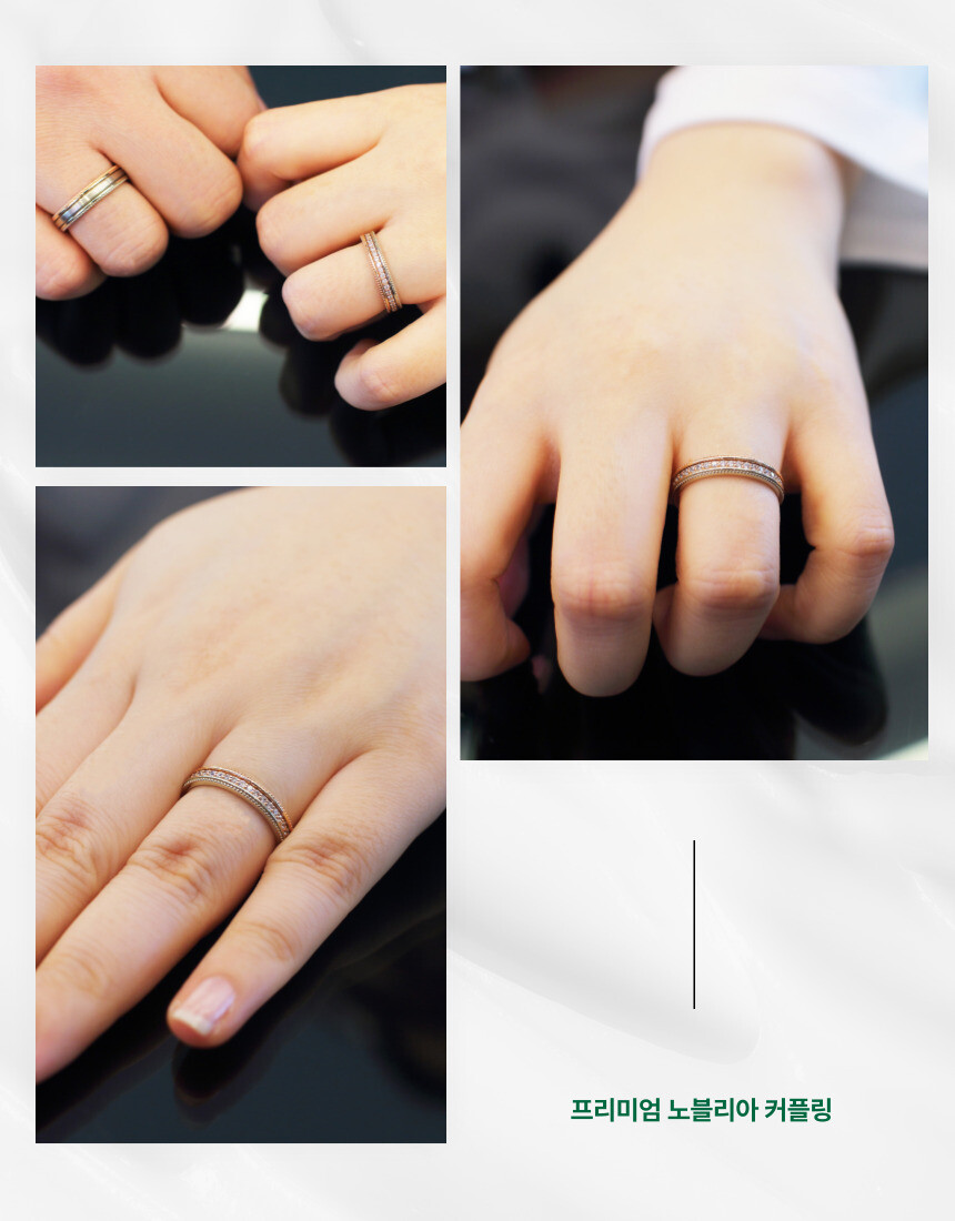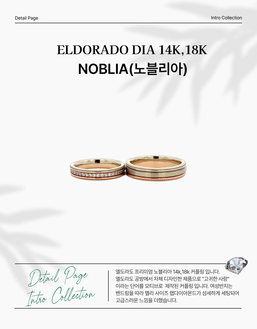 엘도라도 프리미엄 노블리아 14k,18k 커플링입니다. 엘도라도 공방에서 자체 디자인한 제품으로 "고귀한 사랑"이라는 단어를 모티브로 제작된 커플링입니다. 여성반지는 밴드링을 따라 멜리 사이즈 랩다이아몬드가 섬세하게 세팅되어 고급스러운 느낌을 더했습니다.