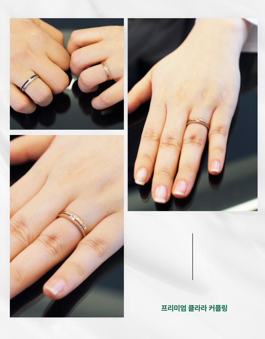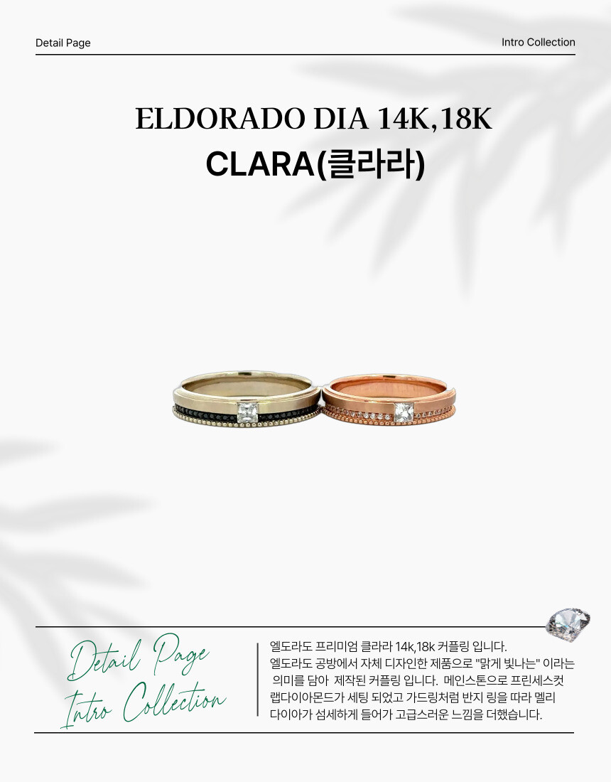 엘도라도 프리미엄 클라라 14k,18k 커플링 입니다. 엘도라도 공방에서 자체 디자인한 제품으로 "맑게 빛나는" 이라는 의미를 담아 제작된 커플링 입니다. 메인스톤으로 프린세스컷 랩다이아몬드가 세팅 되었고 가드링처럼 반지 링을 따라 멜리 다이아가 섬세하게 들어가 고급스러운 느낌을 더했습니다.