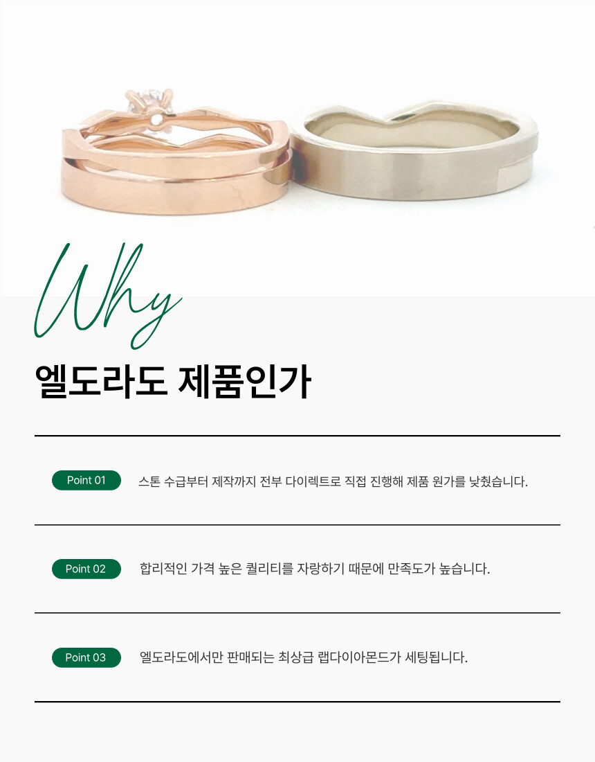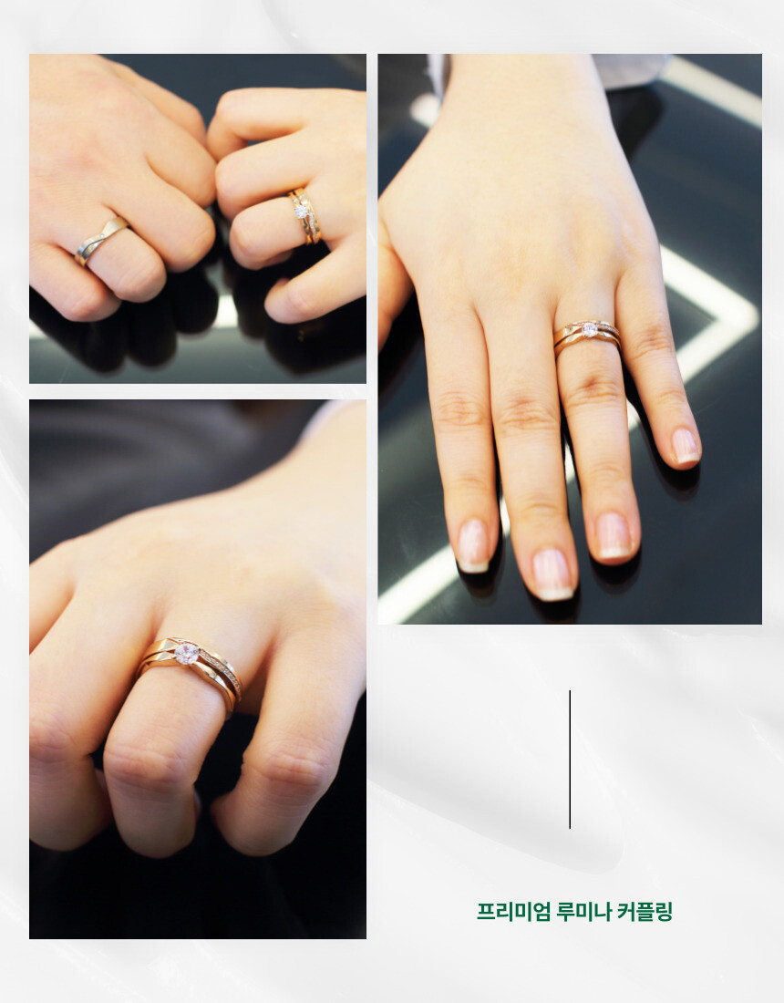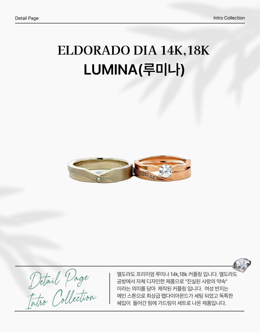 엘도라도 프리미엄 루미나 14k,18k 커플링 입니다. 엘도라도 공방에서 자체 디자인한 제품으로 "진실된 사랑의 약속"이라는 의미를 담아 제작된 커플링 입니다. 여성 반지는 메인 스톤으로 최상급 랩다이아몬드가 세팅 되었고 독특한 쉐입이 들어간 링에 가드링이 세트로 나온 제품입니다.