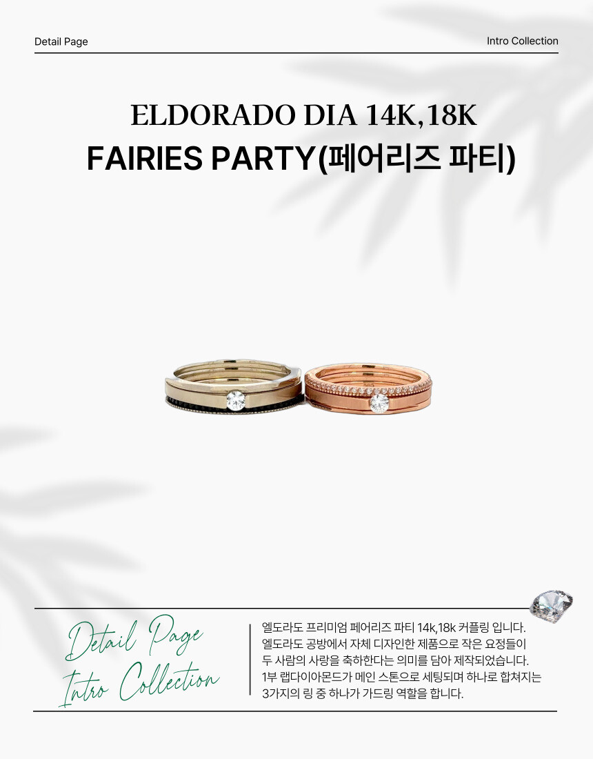엘도라도 프리미엄 페어리즈 파티 14k,18k 커플링 입니다. 엘도라도 공방에서 자체 디자인한 제품으로 작은 요정들이 두 사람의 사랑을 축하한다는 의미를 담아 제작되었습니다. 1부 랩다이아몬드가 메인 스톤으로 세팅되며 하나로 합쳐지는 3가지의 링 중 하나가 가드링 역할을 합니다.