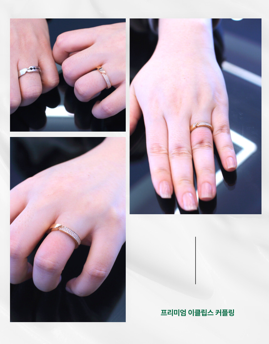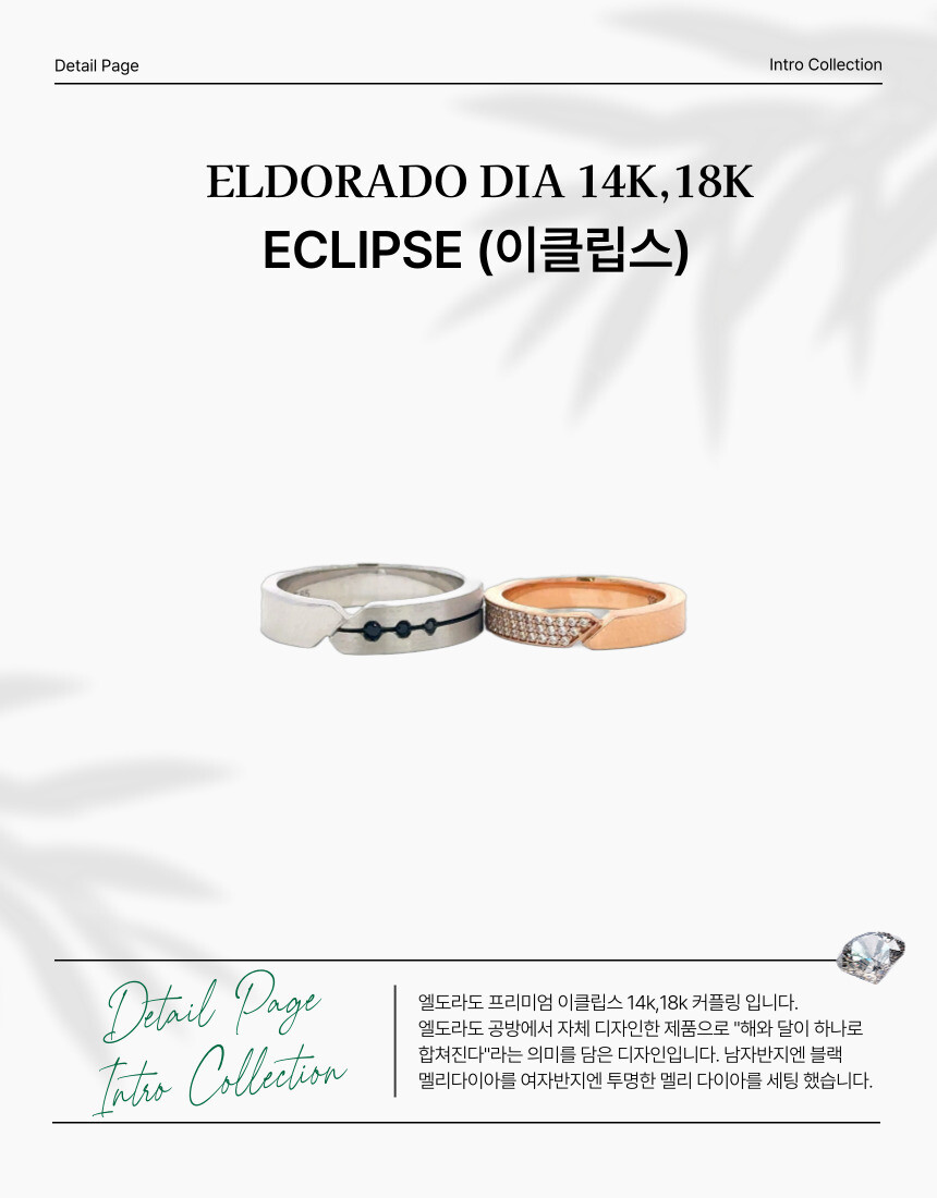 엘도라도 프리미엄 이클립스 14k,18k 커플링 입니다. 엘도라도 공방에서 자체 디자인한 제품으로 "해와 달이 하나로 합쳐진다"는 의미를 담은 디자인입니다. 남자반지엔 블랙 멜리다이아몬드를 여자반지엔 투명한 멜리다이아를 세팅했습니다.