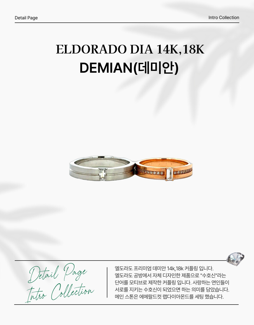엘도라도 프리미엄 데미안 14k,18k 커플링 입니다. 엘도라도 공방에서 자체 디자인한 제품으로 "수호신"라는 단어를 모티브로 제작한 커플링 입니다. 사랑하는 연인들이 서로를 지키는 수호신이 되었으면 하는 의미를 담았습니다. 메인 스톤은 에메랄드컷 랩다이아몬드를 세팅했습니다.