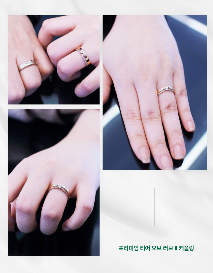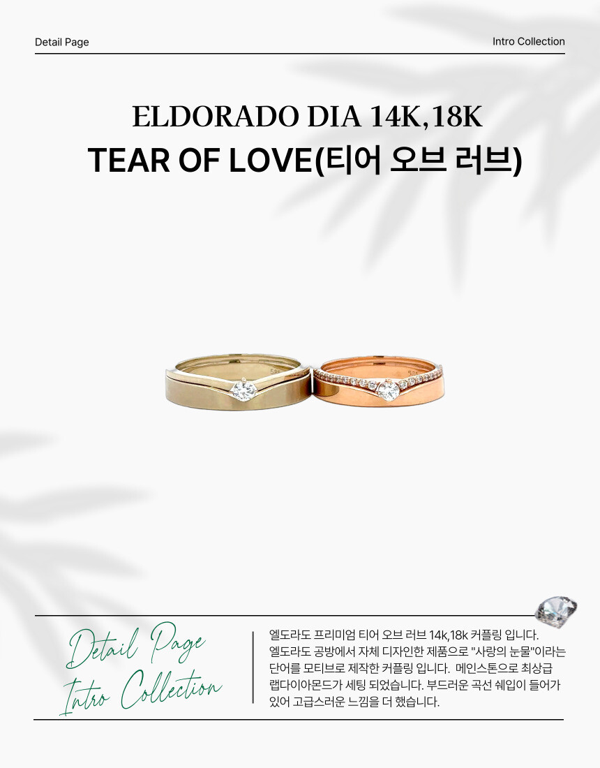엘도라도 프리미엄 티어 오브 러브 14k,18k 커플링 입니다. 엘도라도 공방에서 자체 디자인한 제품으로 "사랑의 눈물"이라는 단어를 모티브로 제작한 커플링 입니다. 메인스톤으로 최상급 랩다이아몬드가 세팅 되었습니다. 부드러운 곡선 쉐입이 들어가 있어 고급스러운 느낌을 더 했습니다.
