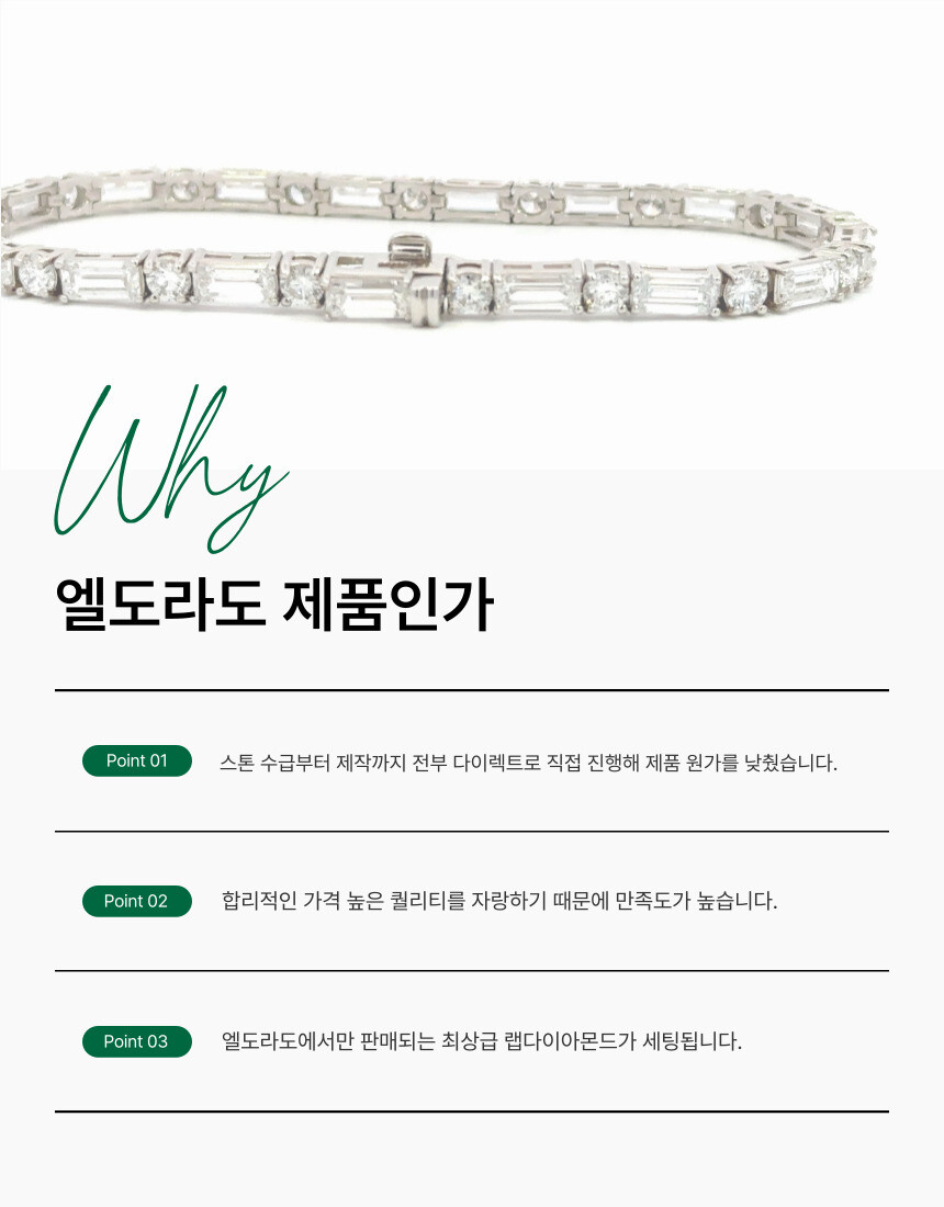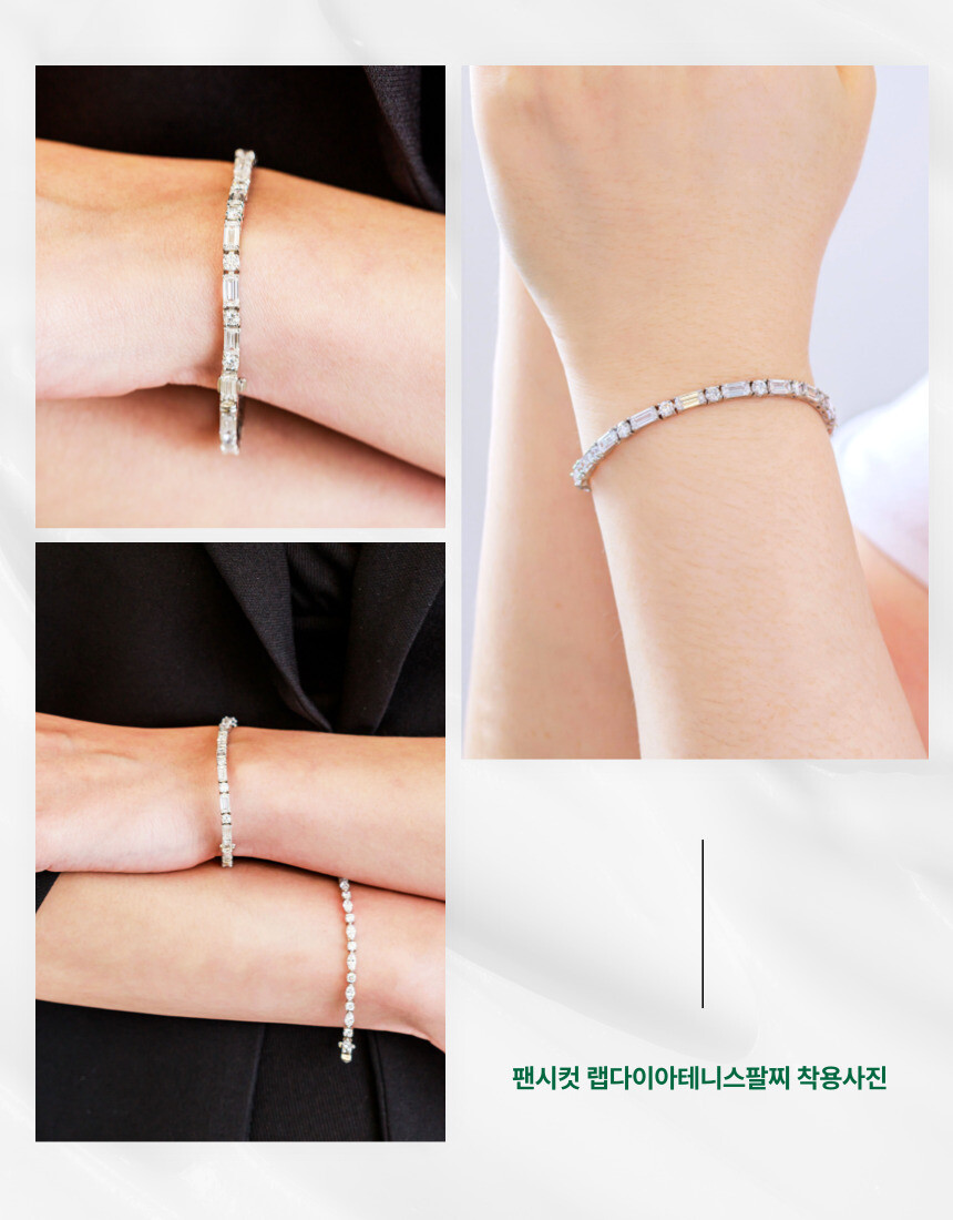 에메랄드컷 랩다이아몬드와 라운드컷 랩다이아몬드가 교차로 세팅되어 유니크한 느낌이 물씬나는 팬시컷 랩다이아몬드 테니스팔찌입니다.