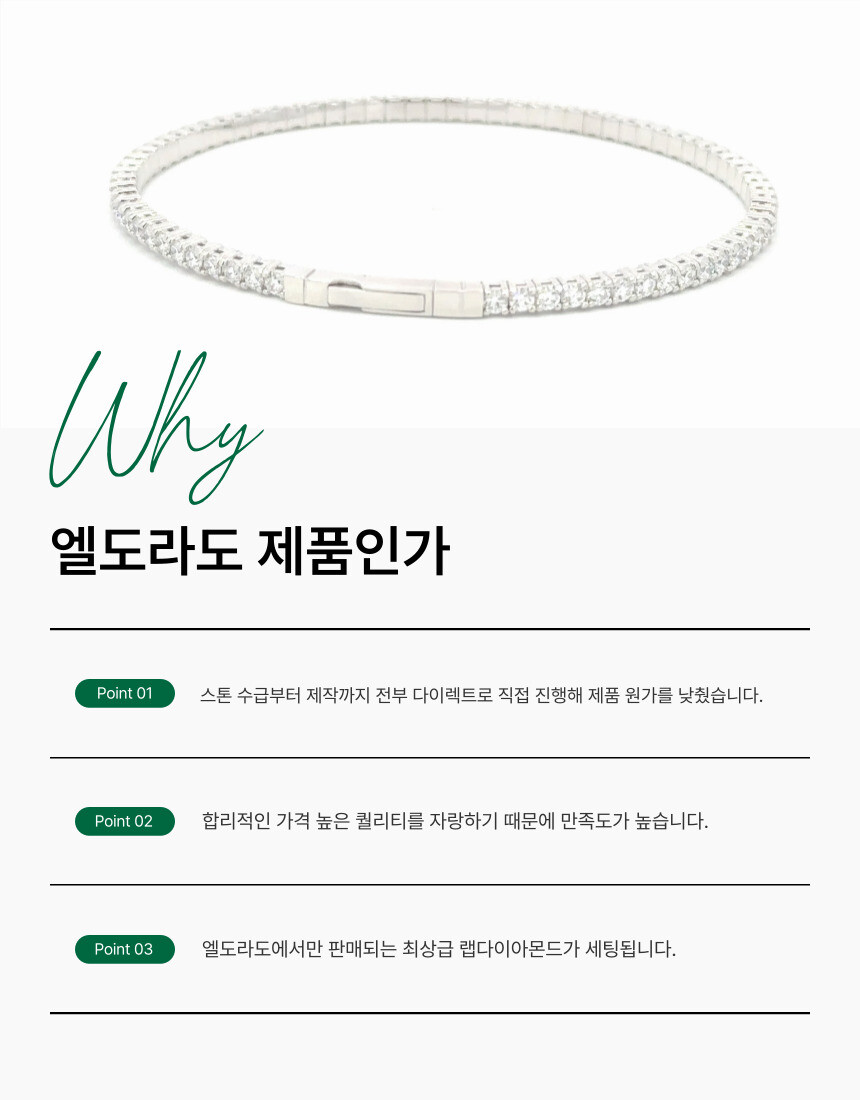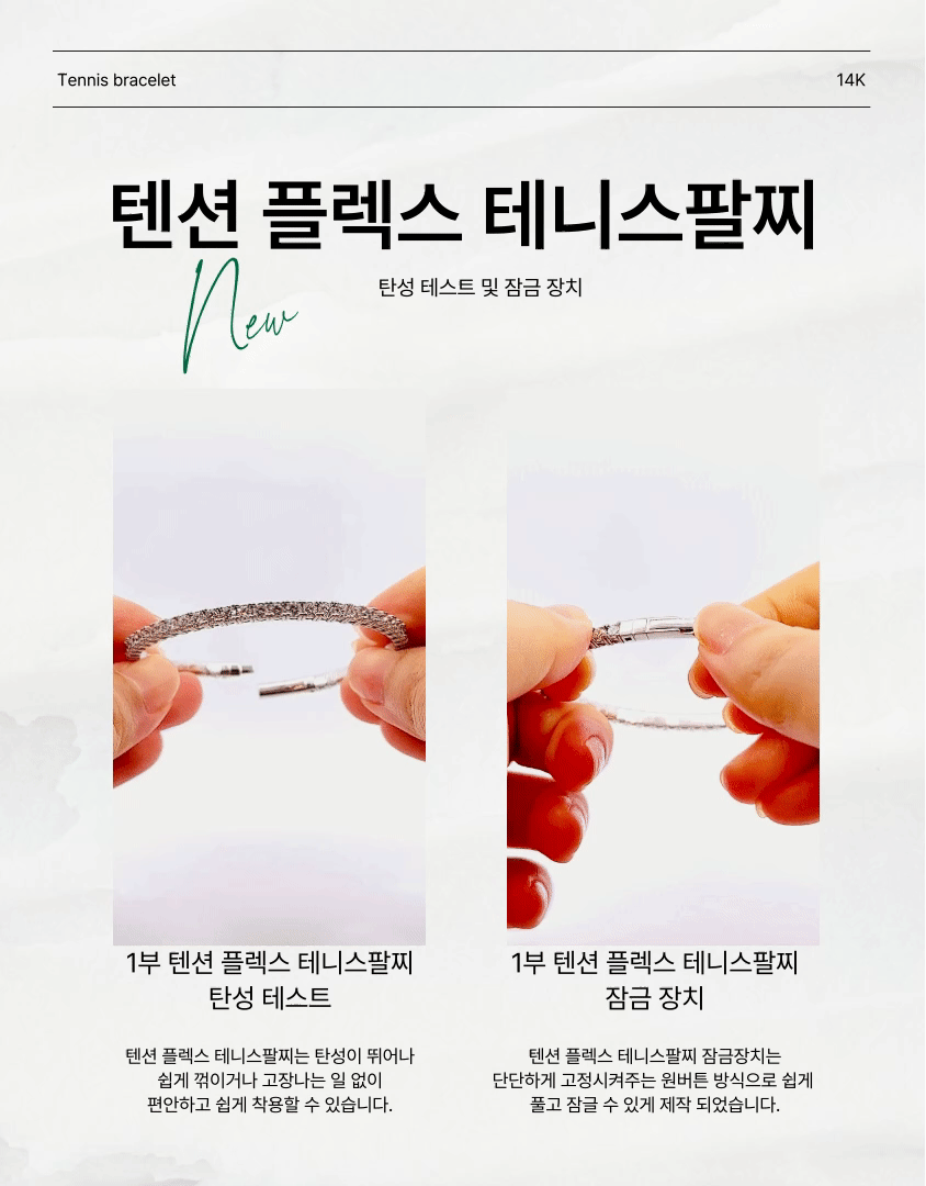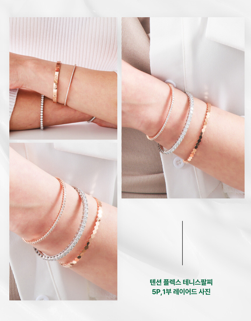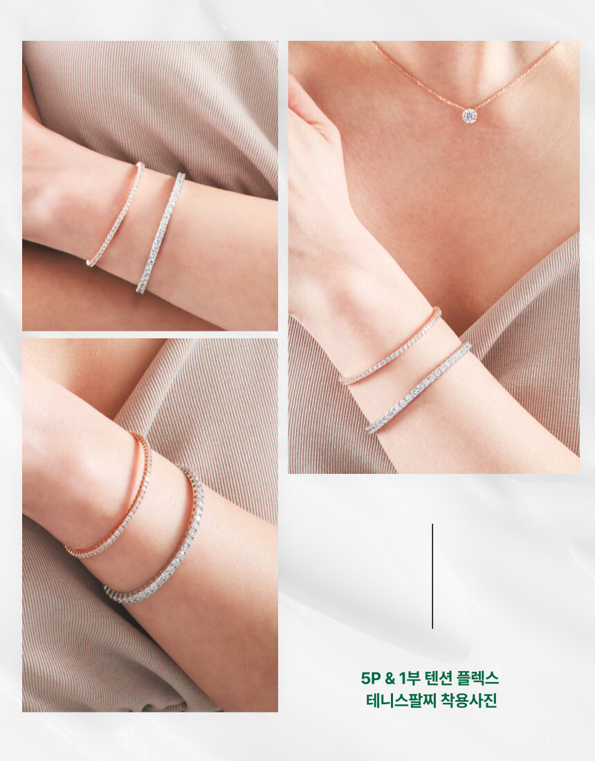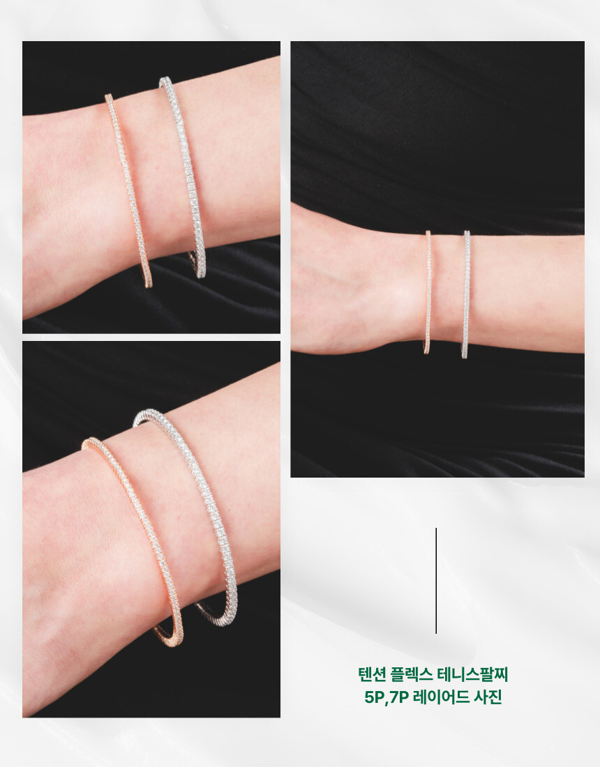 기존 테니스 팔찌보다 내구성이 탄탄하고 말 그대로 텐션이 있는 부드러운 공법으로 제작된 텐션 플렉스 테니스팔찌는 쉽게 꺽이거나 고장나는일 없이 장력이 뛰어나서 편하고 쉽게 착용하 실 수 있습니다. 프롱 세팅은 일반,크라운 세팅 중 택일 가능하고 골드 컬러는 화이트,핑크골드,옐로우골드 중 택일 가능 합니다.