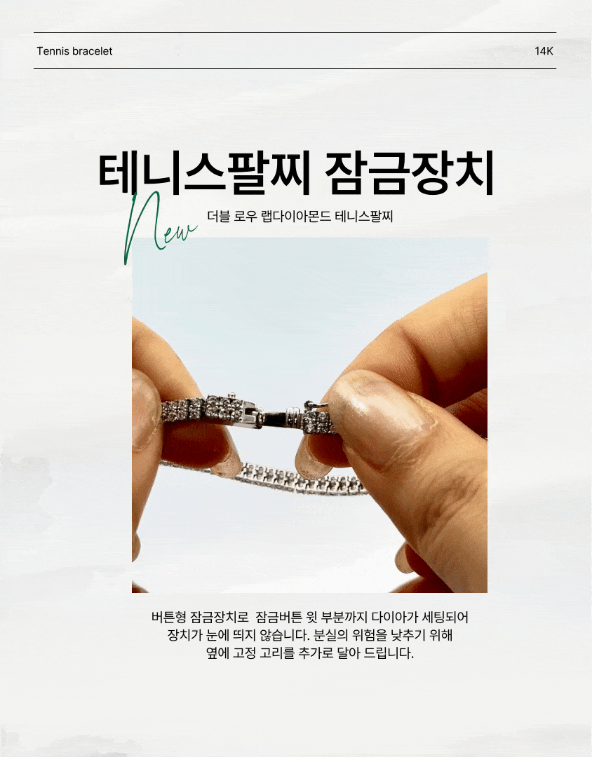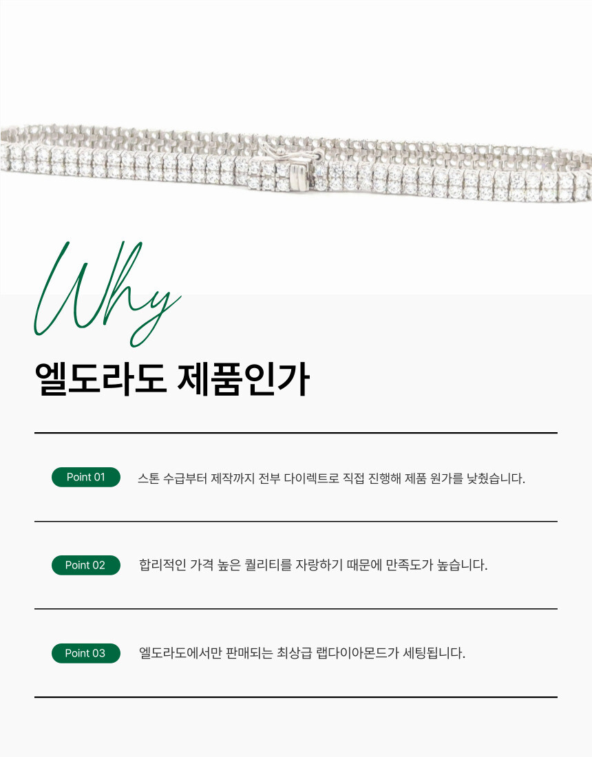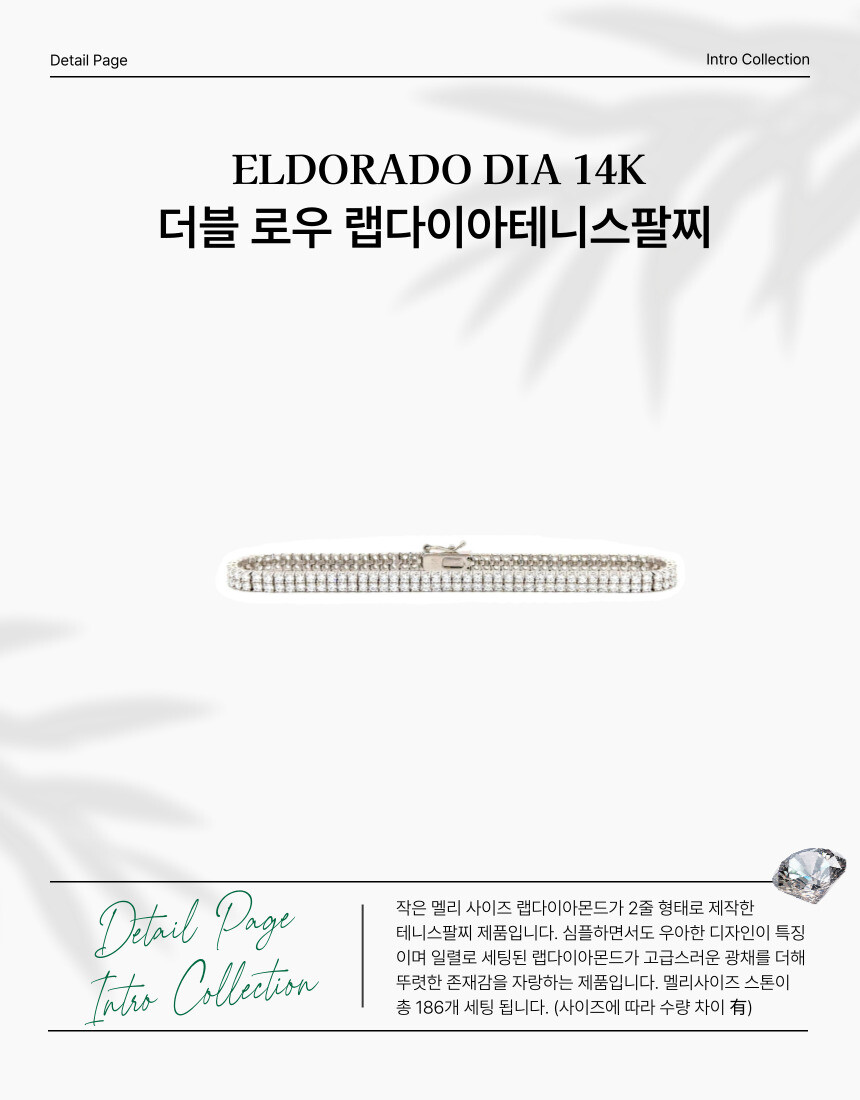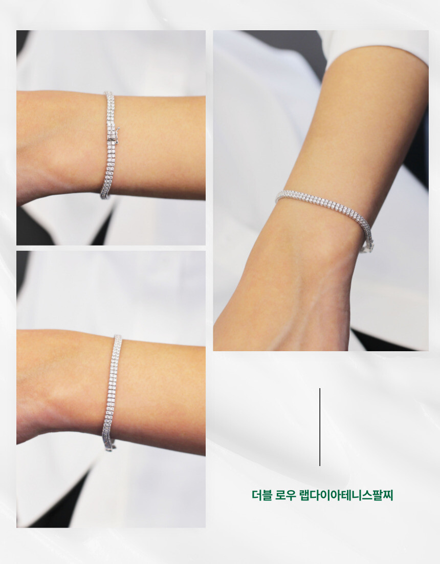 작은 멜리사이즈 랩다이아몬드를 2줄 형태로 제작한 테니스팔찌 제품입니다. 심플하면서도 우아한 디자인이 특징이며 일렬로 세팅 된 랩다이아몬드가 고급스러운 광채를 더해 뚜렷한 존재감을 자랑하는 제품입니다. 멜리사이즈 스톤이 총 186개 세팅 됩니다.