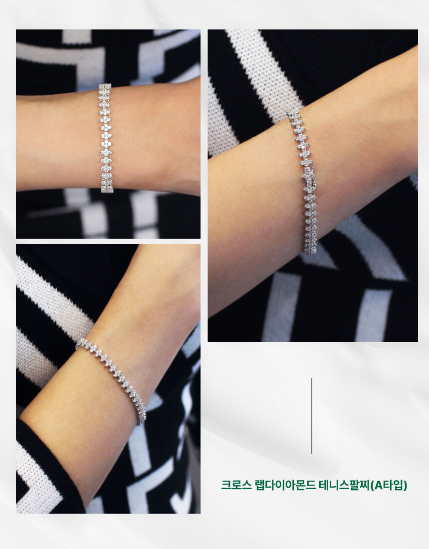 최상급 랩다이아몬드가 십자 형태로 반복적으로 연결된 테니스팔찌 제품입니다. 클래식 하면서도 유니크한 느낌을 주는 세팅 방식으로 단독으로 착용하셔도 눈에 띄는 팔찌입니다.
