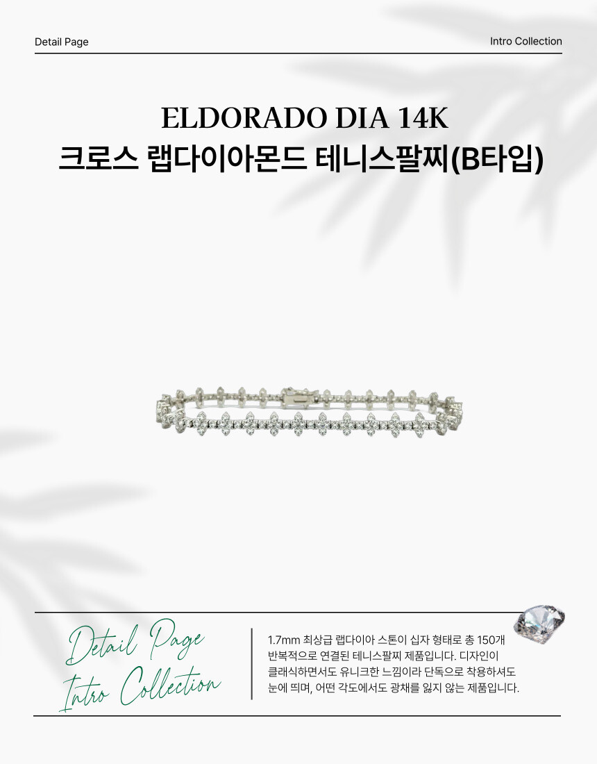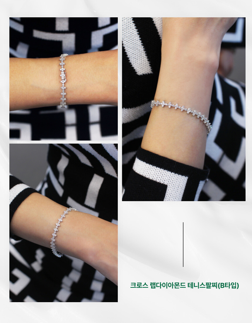 최상급 랩다이아몬드가 십자 형태로 반복적으로 연결된 테니스팔찌 제품입니다. 클래식 하면서도 유니크한 느낌을 주는 세팅 방식으로 단독으로 착용하셔도 눈에 띄는 팔찌입니다.