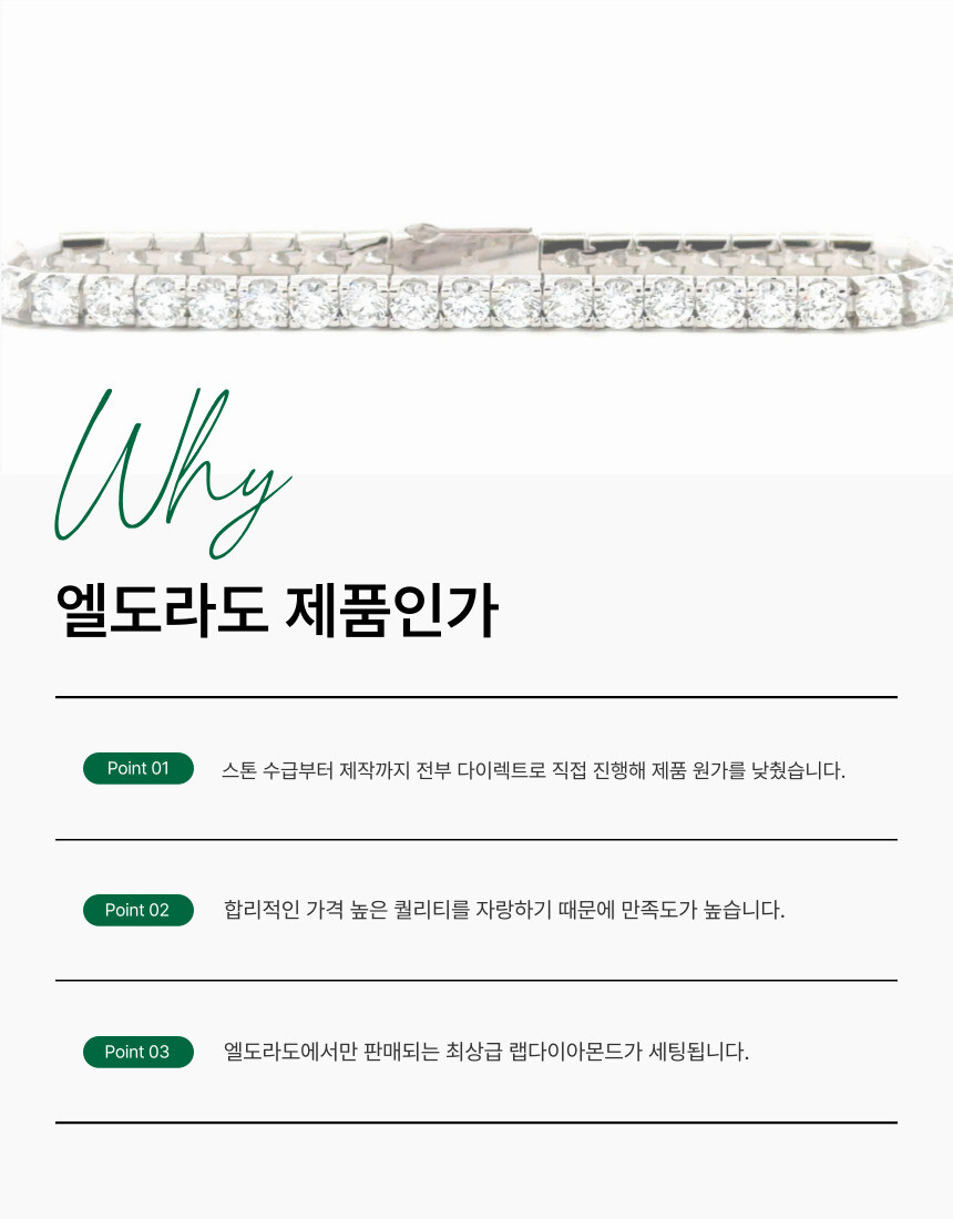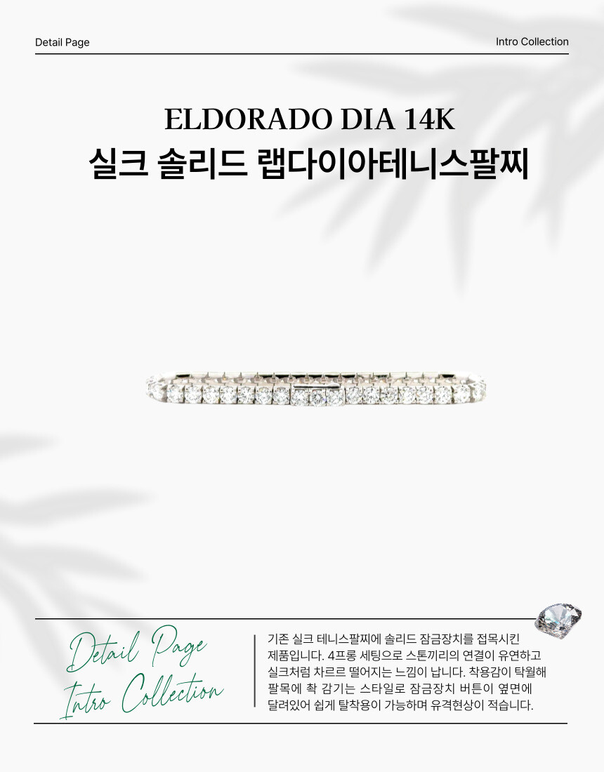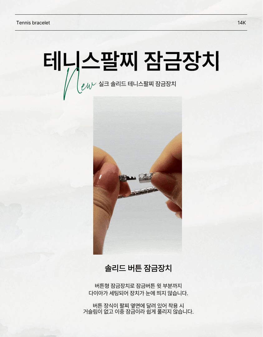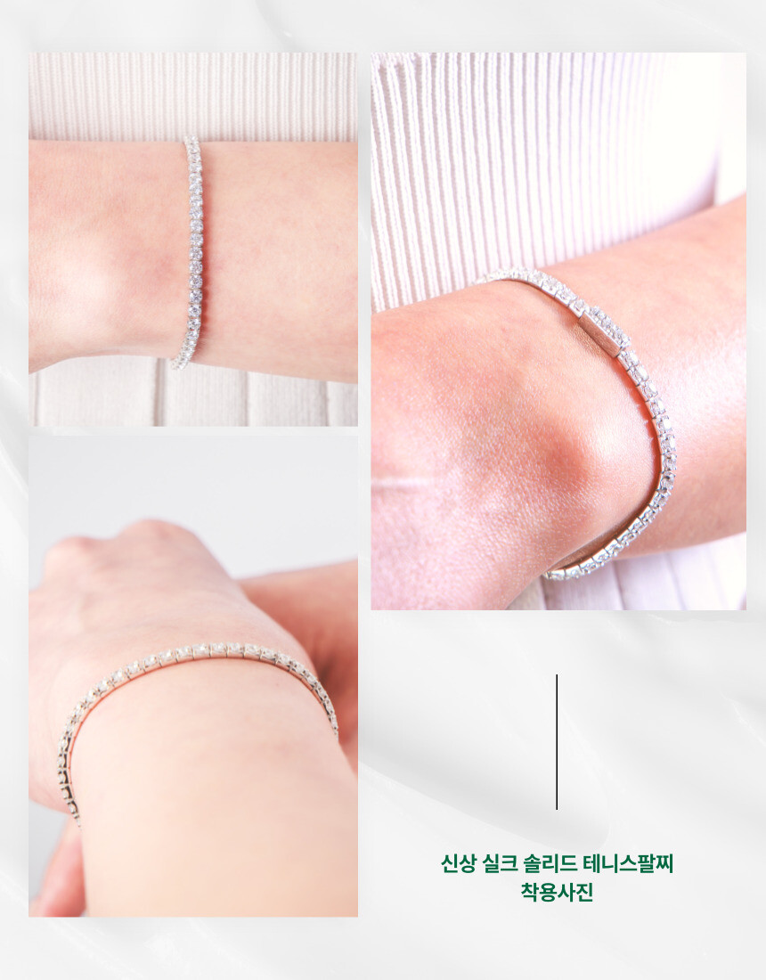 기존 실크 테니스팔찌에 솔리드 잠금장치를 접목시킨 제품입니다. 4프롱 세팅으로 스톤끼리의 연결이 유연하고 실크처럼 차르르 떨어지는 느낌이 납니다. 착용감이 탁월해 팔목에 촥 감기는 스타일로 잠금장치 버튼이 옆면에 달려있어 쉽게 탈착용이 가능하며 테니스팔찌 유격 현상이 적습니다.