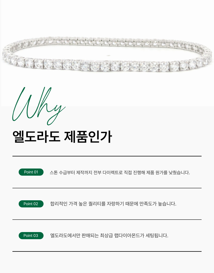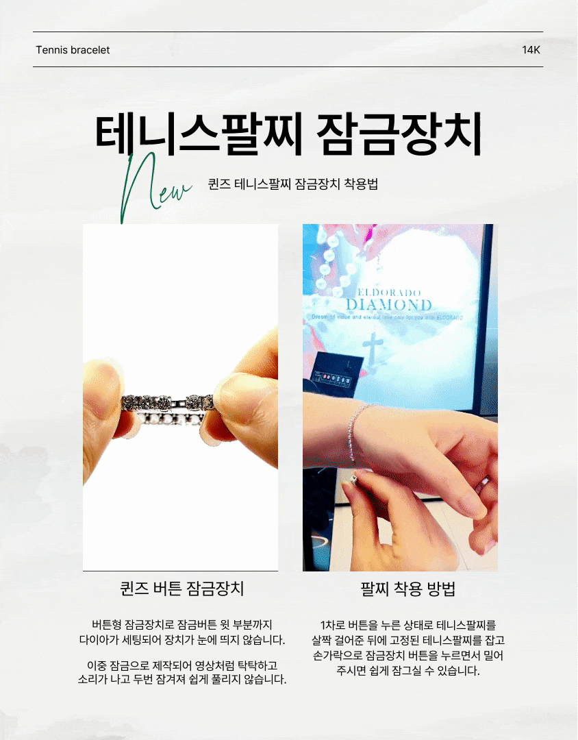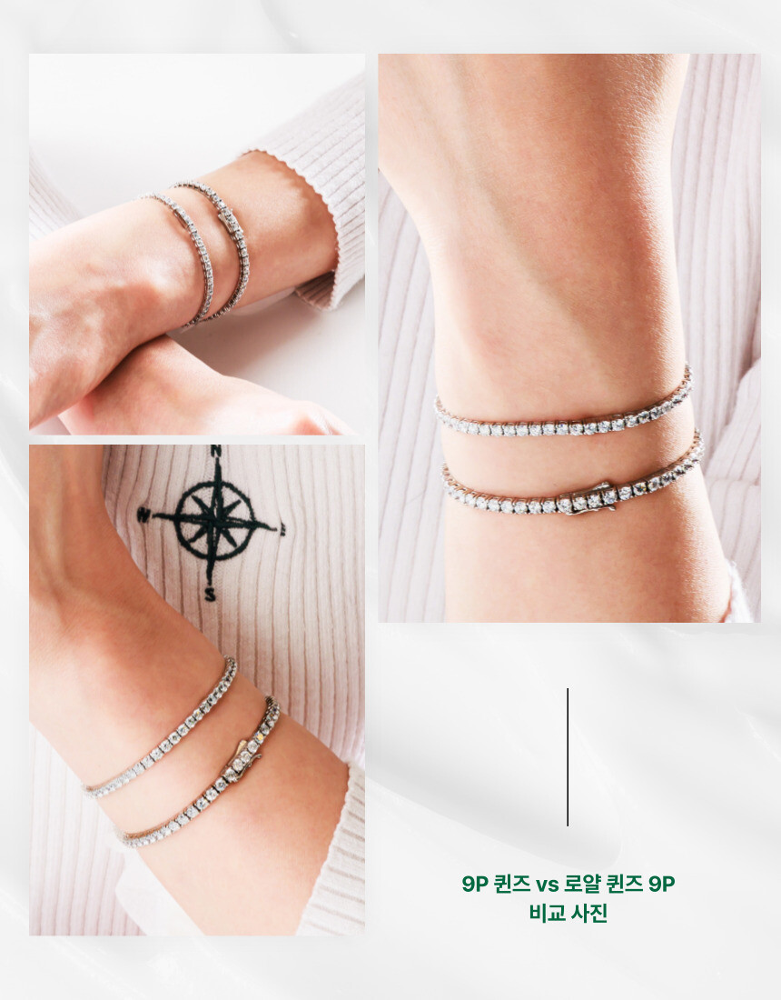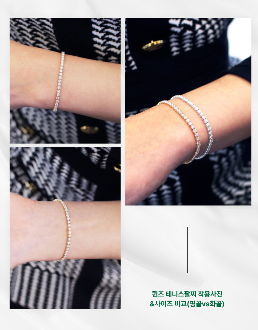 테니스팔찌 완성형에 가까운 제품으로 1부에 가까운 9P 사이즈가 새롭게 출시 되었습니다.잠금장치는 잠금 부위 윗면까지 랩다이아몬드가 세팅되어 잠금 부분이 거의 눈에 띄지 않고 버튼 방식으로 잠글 수 있게 제작 되었습니다.