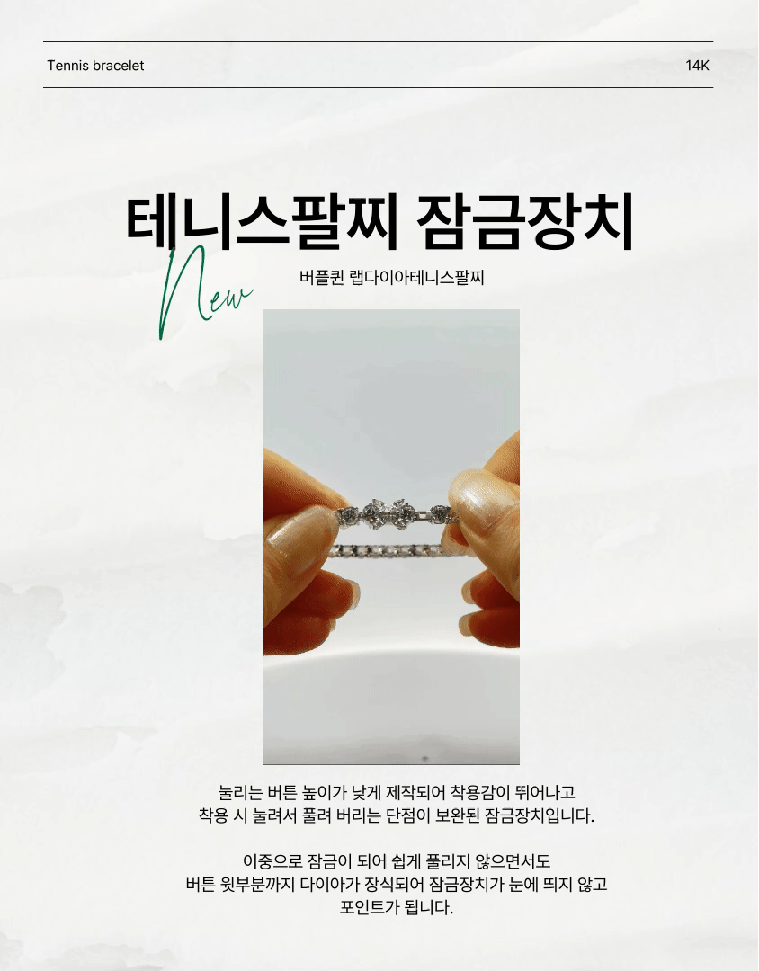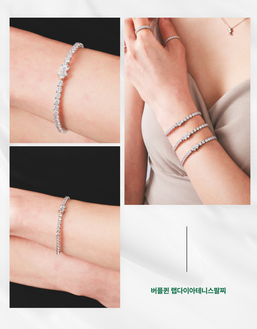 버플퀸 테니스팔찌는 기존 퀸즈 테니스팔찌 업그레이드 버젼으로 새롭게 출시 된 신상 테니스팔찌 제품입니다. 잠금장치 다이아 장식을 마퀴즈 랩다이아 스톤을 나비 모양으로 세팅해 포인트를 준 테니스팔찌 제품으로 라운드컷 마퀴즈컷 스톤을 믹스 매치해 특별한 느낌을 더했습니다.