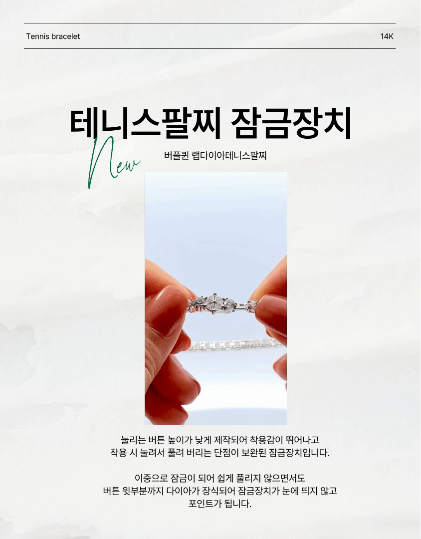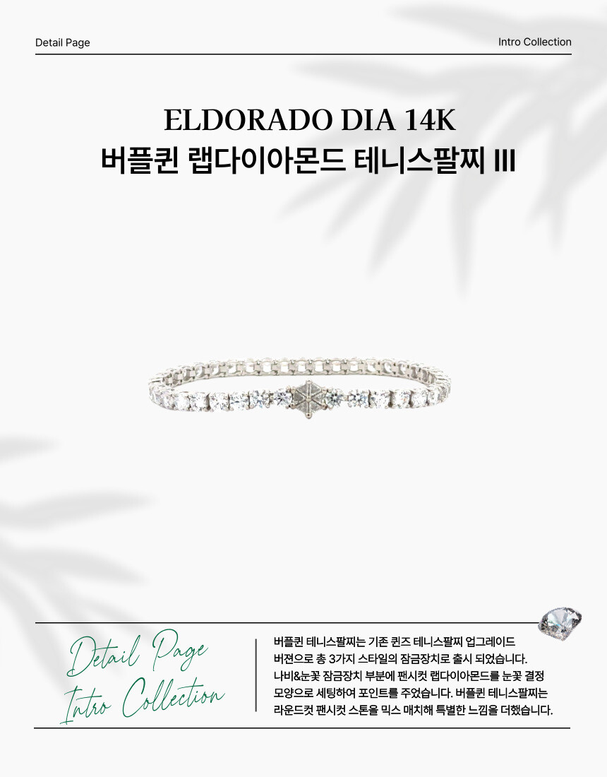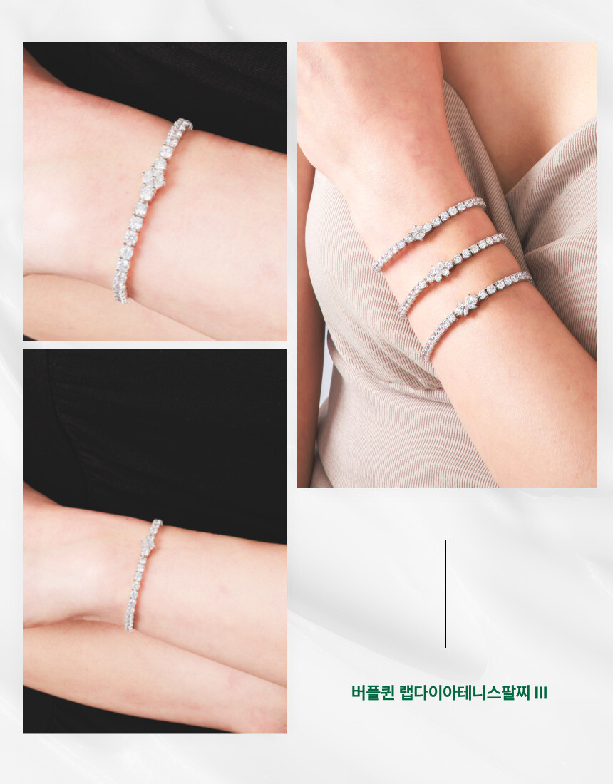 버플퀸 테니스팔찌는 기존 퀸즈 테니스팔찌 업그레이드 버젼으로 총 3가지 스타일의 잠금장치로 출시 되었습니다. 나비&눈꽃 잠금장치 부분에 팬시컷 랩다이아몬드를 눈꽃 결정 모양으로 세팅하여 포인트를 주었습니다. 버플퀸 테니스팔찌는 라운드컷 팬시컷 스톤을 믹스 매치해 특별한 느낌을 더했습니다.