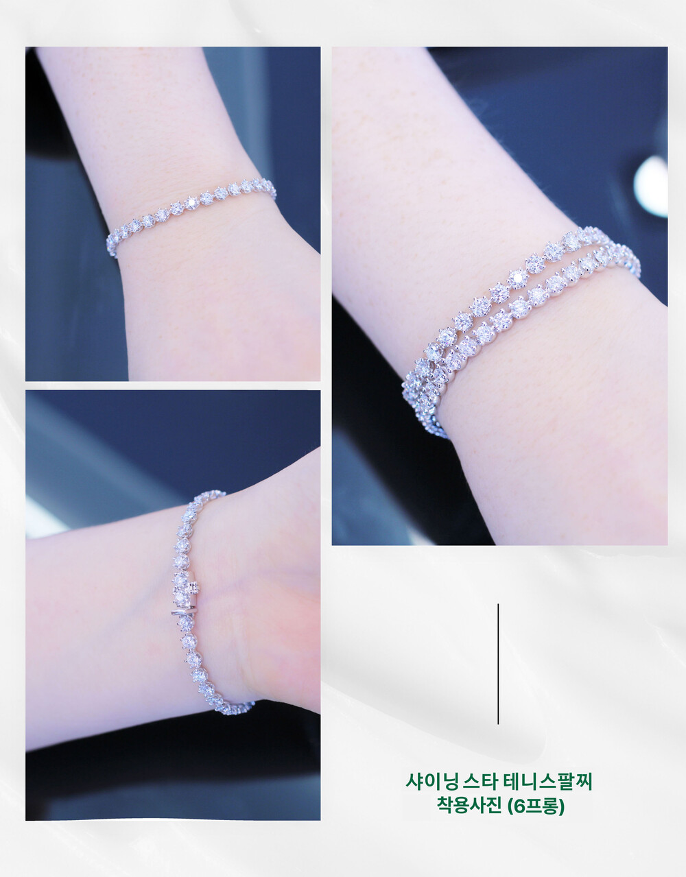 샤이닝스타 테니스팔찌는 스톤을 지탱하는 프롱이 총 6개로 제작 되었으며 별처럼 반짝이는 느낌을 줍니다. 일반 프롱 디자인보다 더 안정적으로 스톤을 받쳐줍니다. (1.2K,14K 주문 가능합니다.)