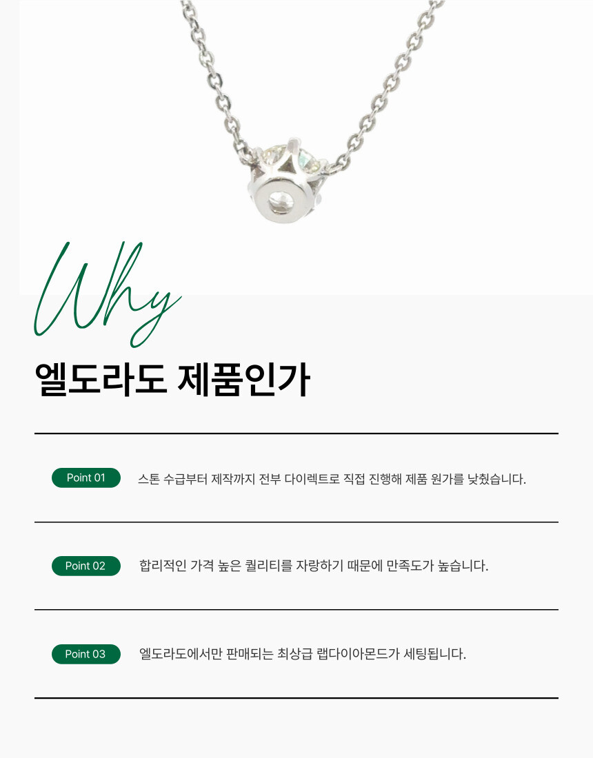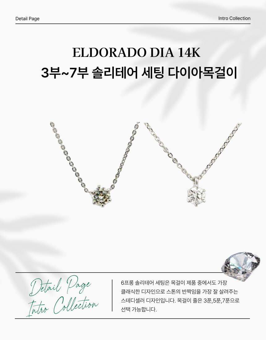 6프롱 솔리테어 세팅은 목걸이 제품 중에서도 가장 인기가 많은 제품으로 엘도라도 스테디셀러 제품 중에 하나입니다. 일체형과 고리형 중에 선택이 가능하고 목걸이 줄은 3푼,5푼,7푼 중에서 선택 가능합니다.