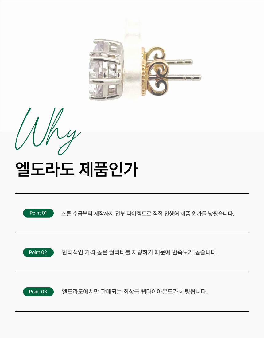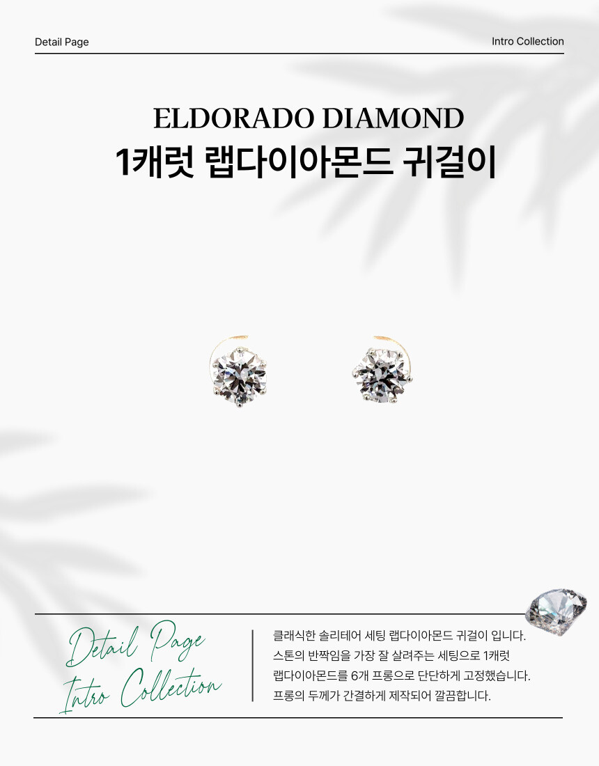 6프롱 솔리테어 세팅은 귀걸이 제품 중에서도 가장 인기가 많은 제품으로 엘도라도 스테디셀러 제품 중에 하나입니다. 스톤의 반짝임을 가장 잘 살려주는 세팅입니다.