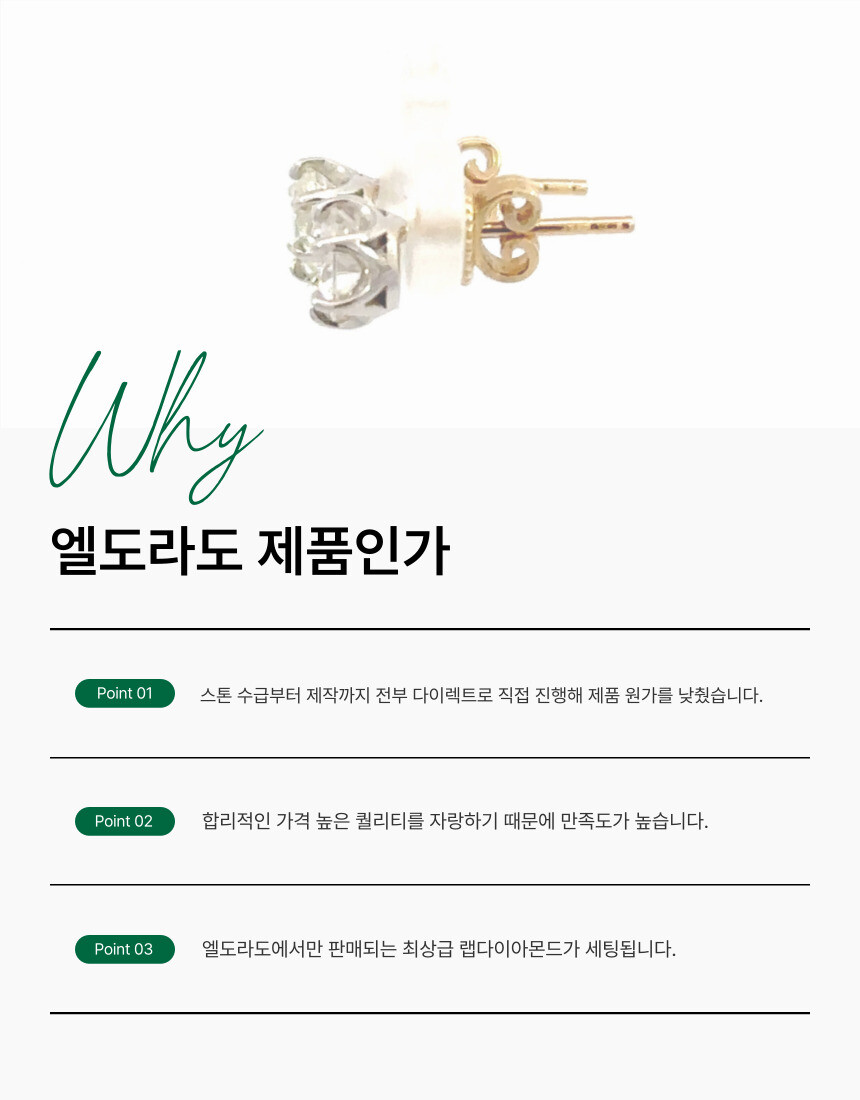 6프롱 솔리테어 세팅은 귀걸이 제품 중에서도 가장 인기가 많은 제품으로 엘도라도 스테디셀러 제품 중에 하나입니다. 스톤의 반짝임을 가장 잘 살려주는 세팅입니다.
