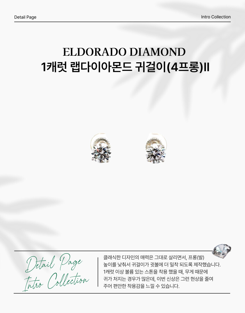 클래식한 디자인의 매력은 그대로 살리면서, 프롱(발) 높이를 낮춰서 귀걸이가 귓볼에 더 밀착 되도록 제작했습니다. 1캐럿 이상 볼륨 있는 스톤을 착용 했을 때, 무게 때문에 귀가 처지는 경우가 많은데, 이번 신상은 그런 현상을 줄여 주어 편안한 착용감을 느낄 수 있습니다.