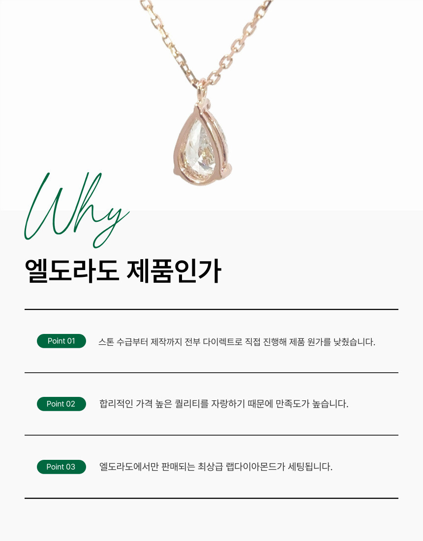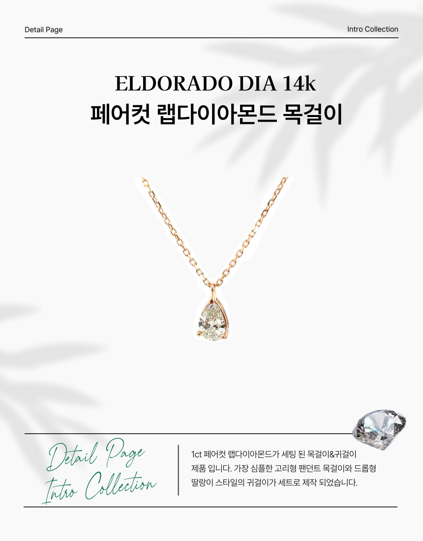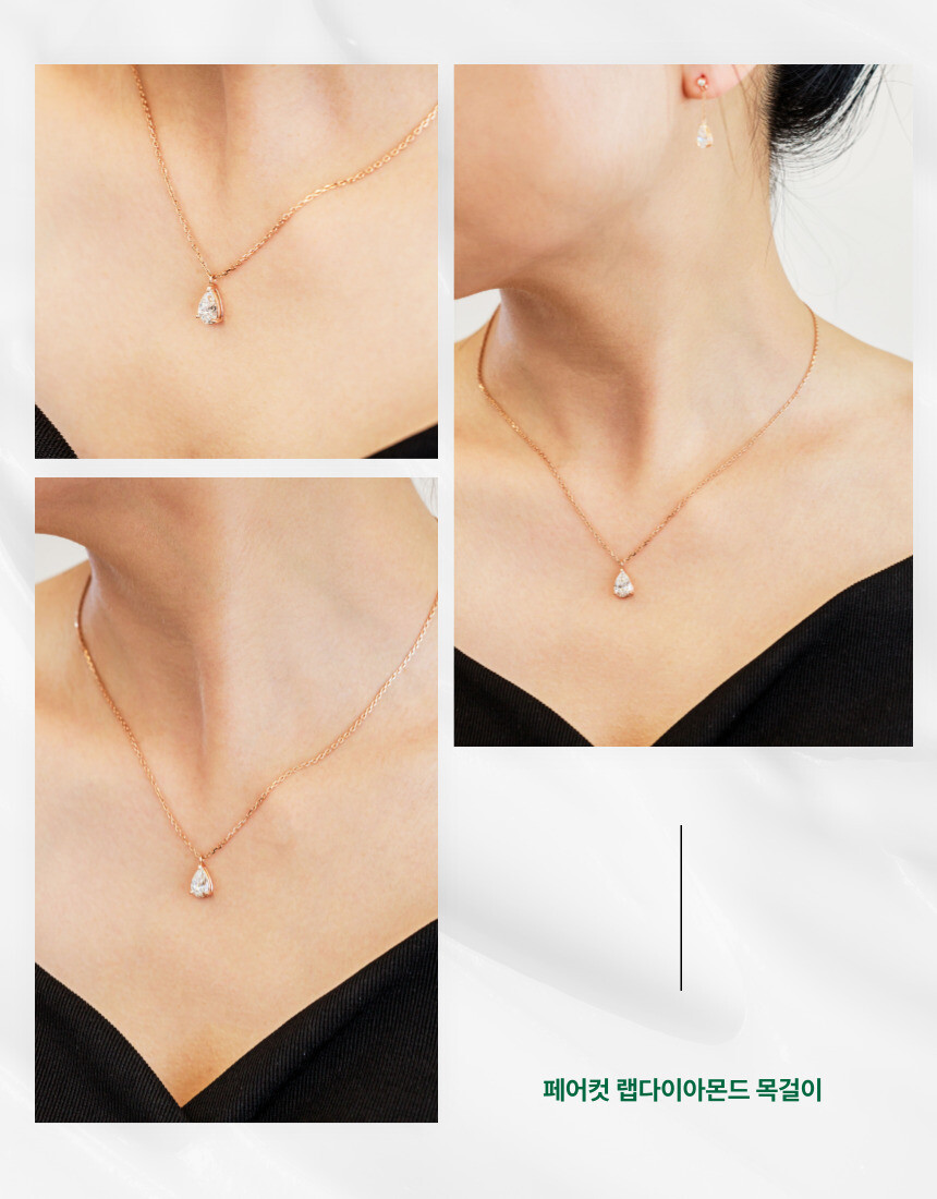 1ct 페어컷 랩다이아몬드가 세팅 된 목걸이&귀걸이 제품입니다. 가장 심플한 고리형 팬던트 목걸이와 드롭형 딸랑이 스타일의 귀걸이가 세트로 제작 되었습니다.