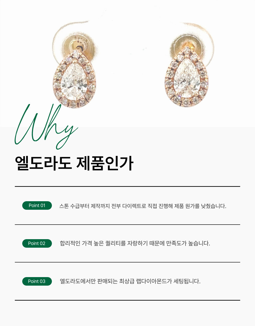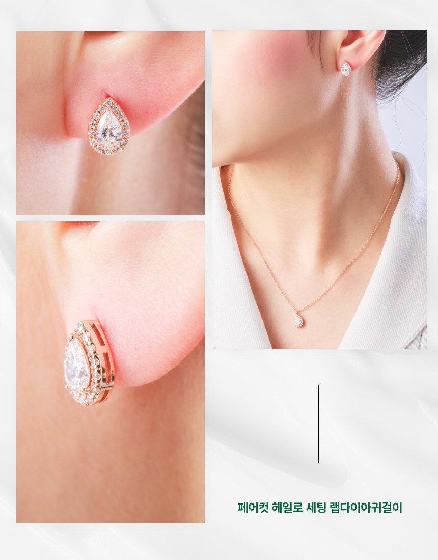 최상급 페어컷 랩다이아몬드 주변을 작은 멜리 다이아가 감싸는 헤일로 세팅으로 제작된 귀걸이 제품입니다. 실제 스톤의 크기보다 커보이는 효과가 있어 작은 다이아를 커보이도록 맞추고 싶은 분들에게 추천 드리는 세팅 방식입니다.