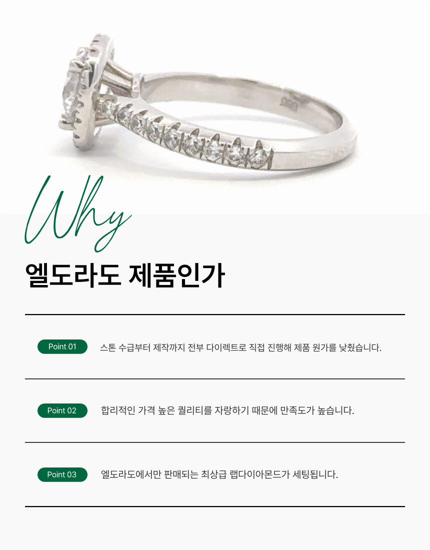 메인스톤을 돋보이게 하기 위해 작은 다이아몬드를 스퀘어 형태로 둘러싸 세팅 된 디자인으로 기존 스톤의 크기보다 더 커보이는 장점이 있는 세팅 기법입니다. 링 옆 부분에도 포인트가 될 수 있게 멜리 사이즈 다이아가 세팅 되었습니다.