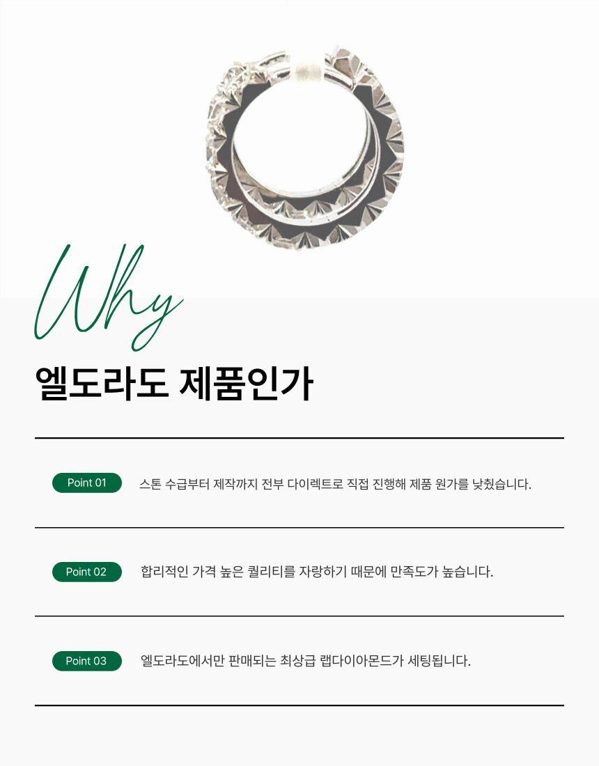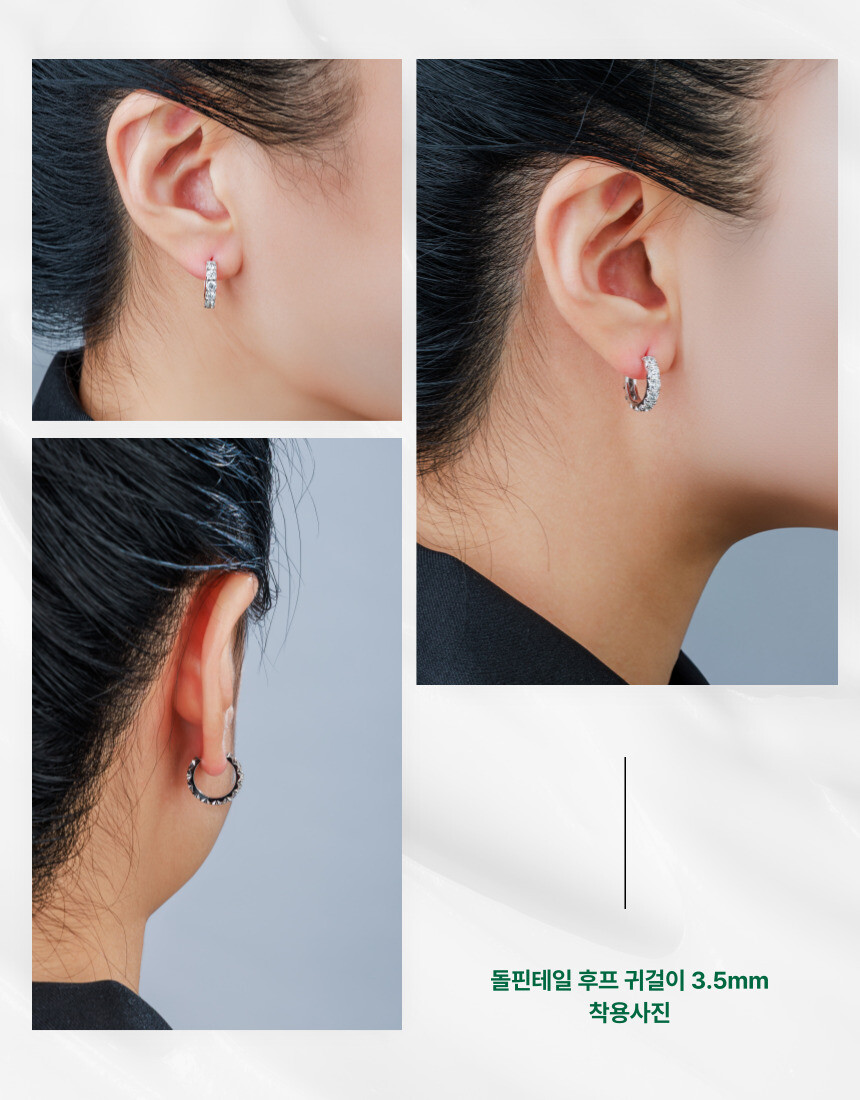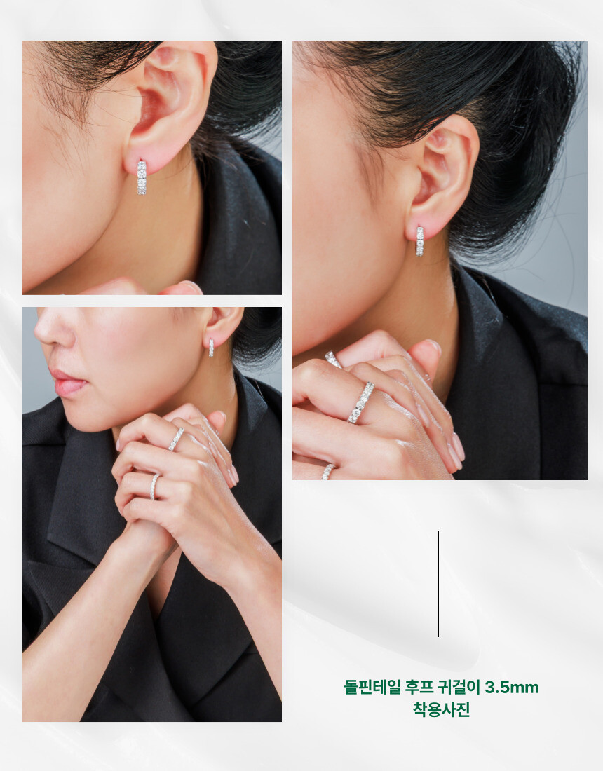 귀걸이 전면에만 랩다이아몬드가 세팅되어 데일리로 부담없이 착용 가능한 후프형 귀걸이 입니다. 귀걸이 측면에 행운을 상징하는 돌고래 꼬리 형태로 디테일이 들어가 있어 고급스러운 라인을 구현했고 프롱 구조가 스톤을 봉긋하게 감싸며 안정적으로 고정해줍니다. 정면에서 봤을 때 다이아몬드의 존재감이 더 극대화 됩니다.