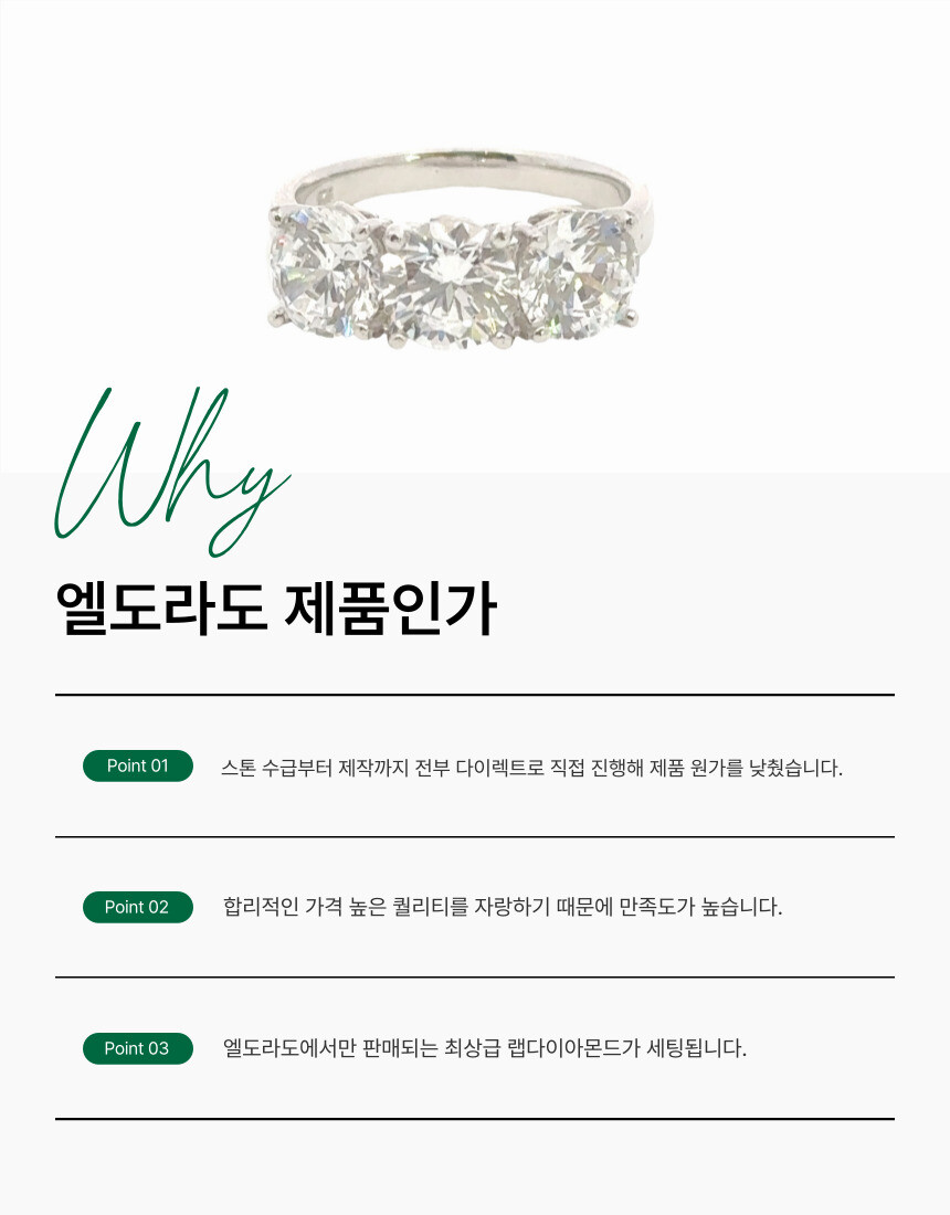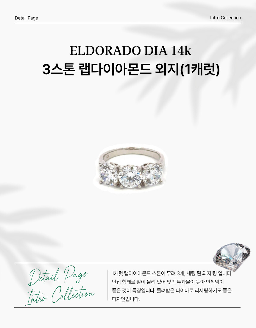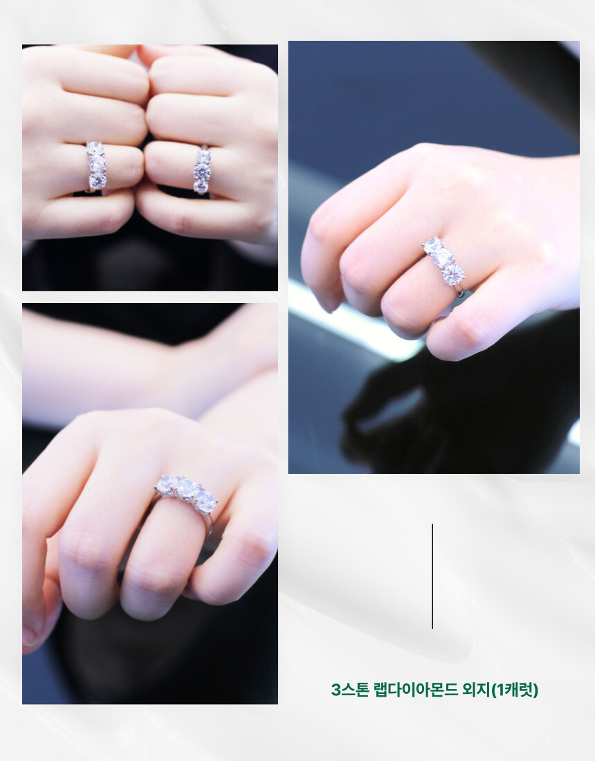 1캐럿 랩다이아몬드 스톤이 무려 3개, 세팅 된 외지 링 입니다. 난집 형태로 발이 물려 있어 빛의 투과율이 높아 반짝임이 좋은 것이 특징입니다. 물려받은 다이아로 리세팅하기도 좋은 디자인입니다.