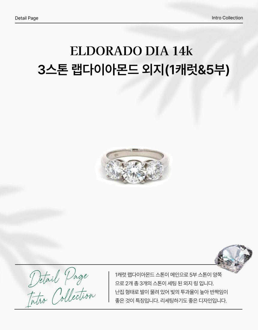 1캐럿 랩다이아몬드 스톤이 메인으로 5부 스톤이 양쪽으로 2개 총 3개의 스톤이 세팅 된 외지 링 입니다. 난집 형태로 발이 물려 있어 빛의 투과율이 높아 반짝임이 좋은 것이 특징입니다. 리세팅하기도 좋은 디자인입니다.