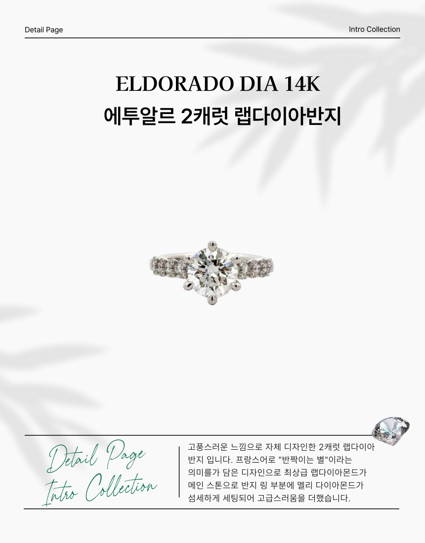 고풍스러운 느낌으로 자체 디자인한 2캐럿 랩다이아반지 입니다. 프랑스어로 "반짝이는 별"이라는 의미를가 담은 디자인으로 최상급 랩다이아몬드가 메인 스톤으로 반지 링 부분에 멜리 다이아몬드가 섬세하게 세팅 되어 고급스러움을 더했습니다.