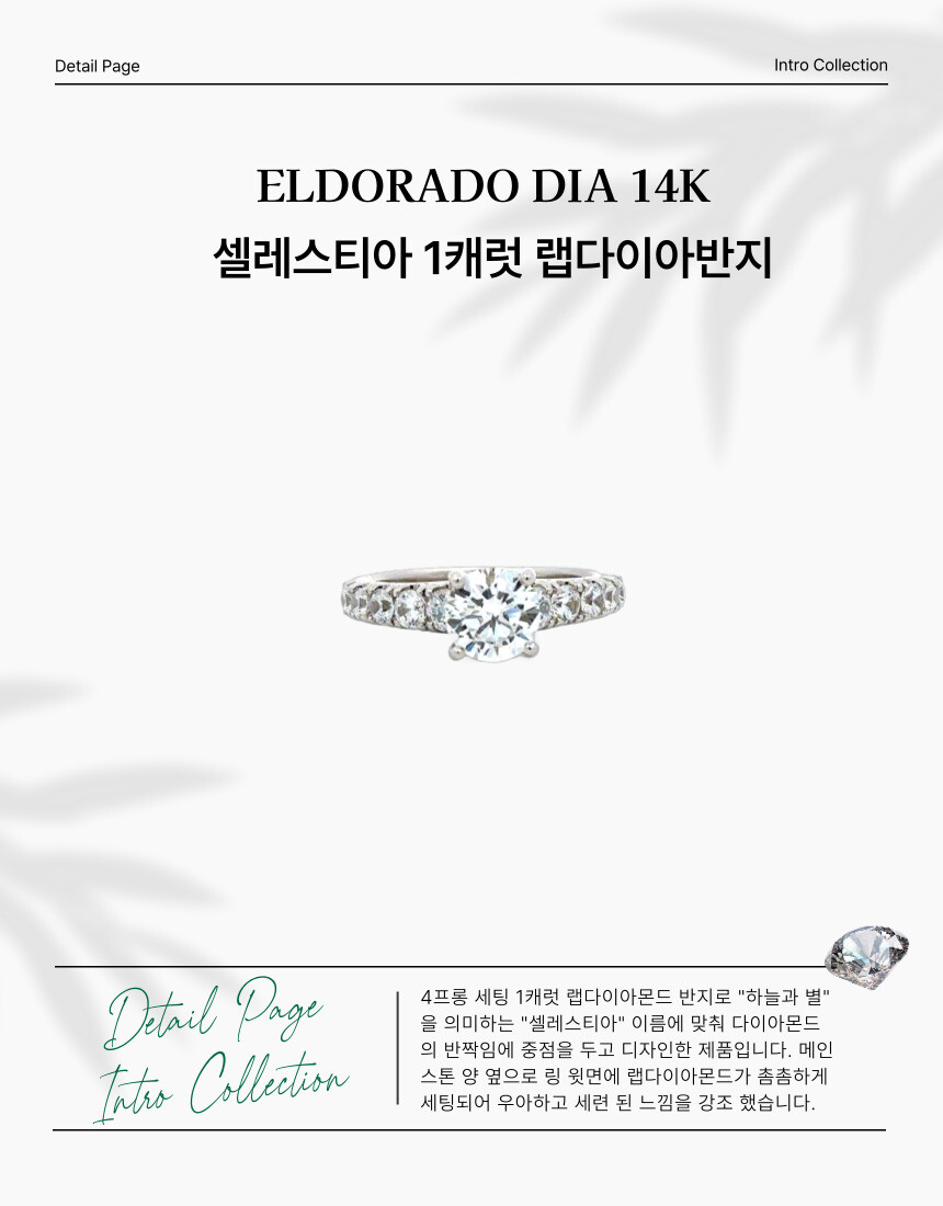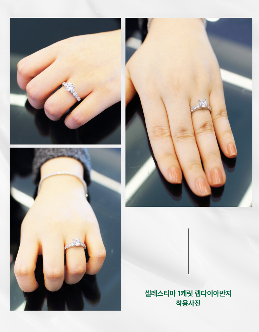4프롱 세팅 1캐럿 랩다이아몬드 반지로 "하늘과 별"을 의미하는 "셀레스티아" 이름에 맞춰 다이아몬드의 반짝임에 중점을 두고 디자인한 제품입니다. 메인 스톤 양 옆으로 링 윗면에 랩다이아몬드가 촘촘하게 세팅되어 우아하고 세련 된 느낌을 강조 했습니다.