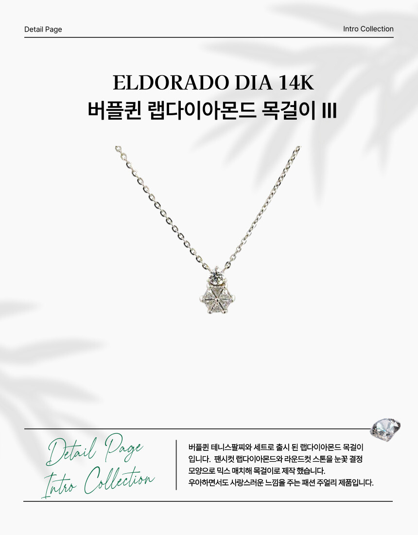 버플퀸 테니스팔찌와 세트로 출시 된 랩다이아몬드 목걸이입니다. 팬시컷 랩다이아몬드와 라운드컷 스톤을 눈꽃 결정 모양으로 믹스 매치해 목걸이로 제작 했습니다. 우아하면서도 사랑스러운 느낌을 주는 패션 주얼리 제품입니다.