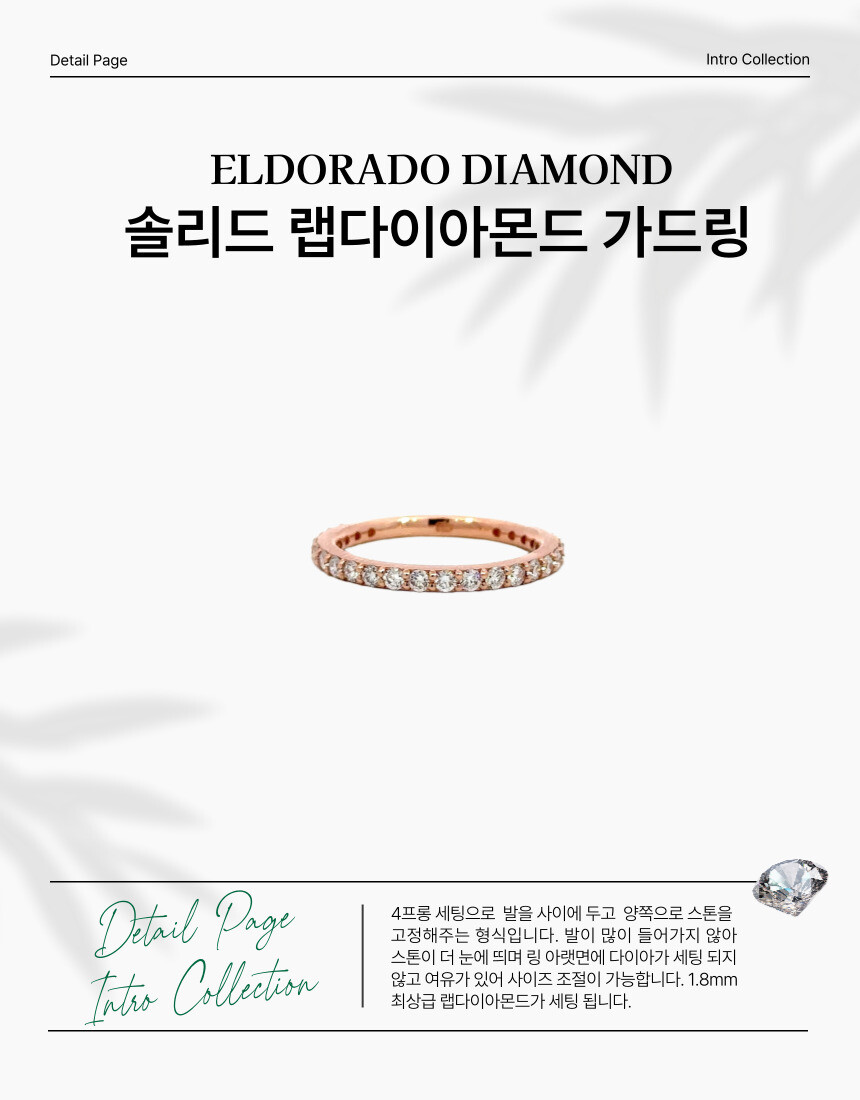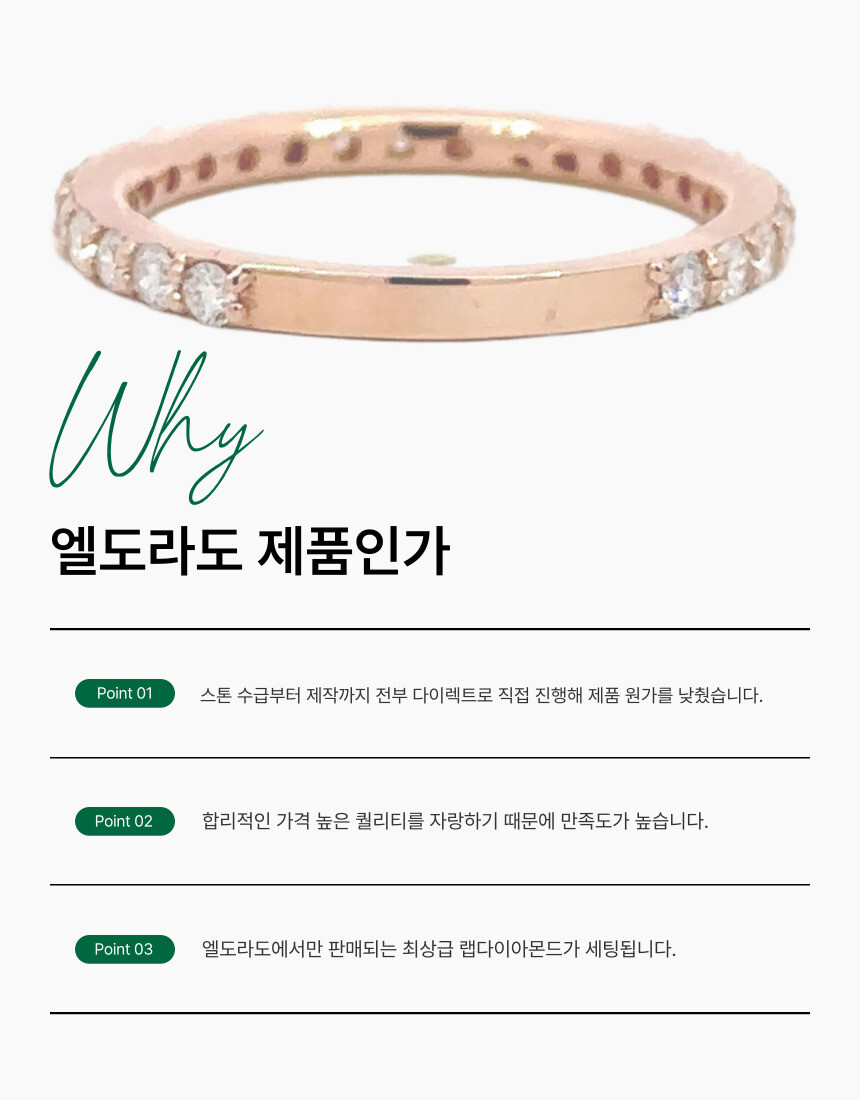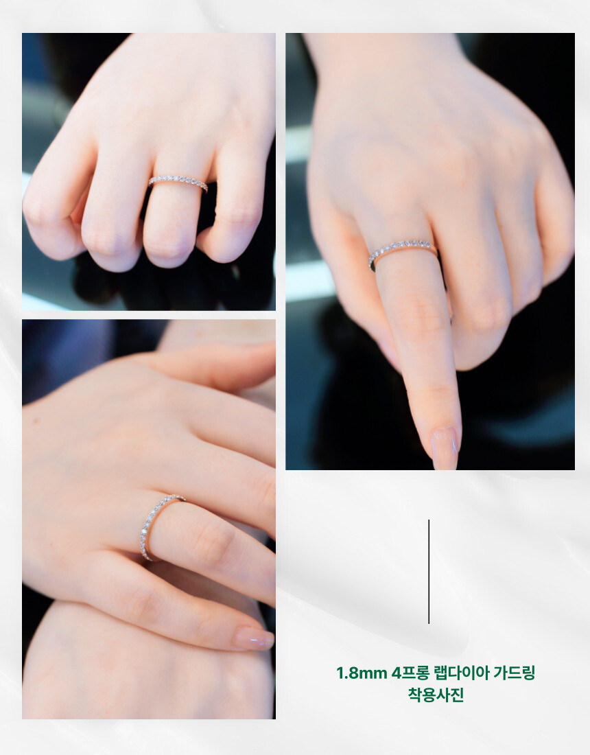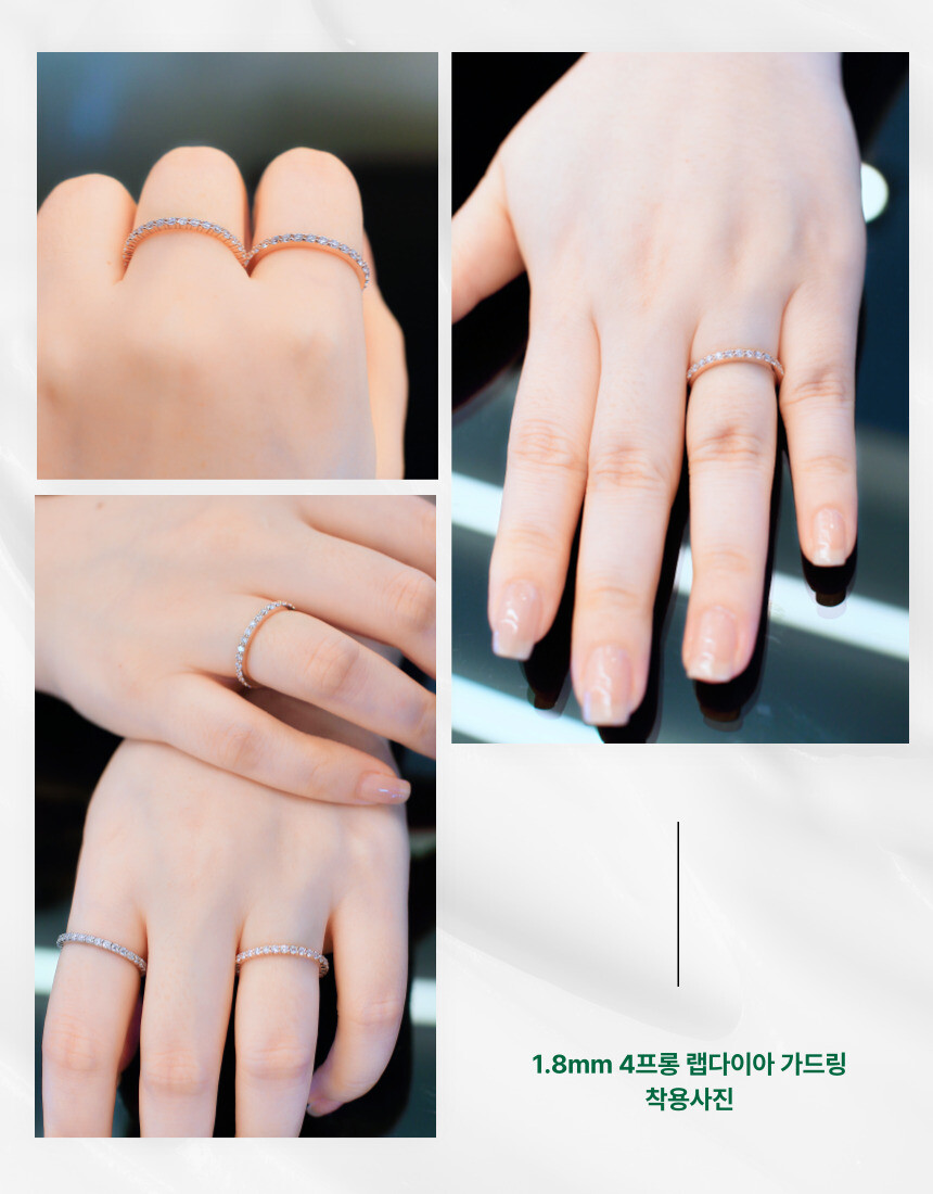 4프롱 세팅으로 발을 사이에 두고 양쪽으로 스톤을 고정해주는 형식입니다. 발이 많이 들어가지 않아 스톤이 더 눈에 띄며 링 아랫면에 다이아가 세팅 되지 않고 여유가 있어 사이즈 조절이 가능합니다. 1.8mm 최상급 랩다이아몬드가 세팅 됩니다.