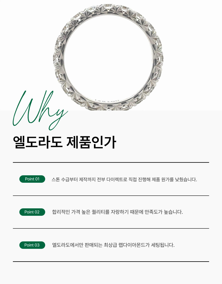 행운을 상징하는 돌고래 꼬리 형태로 조각 된 이터니티 링으로 반지 옆면이 V자 형태로 깊게 홈을 파내 빛을 반사하여 다각도에서 반짝임이 포착 됩니다. 다이아 하나 하나에 조각 세팅이 들어가 반지가 입체적입니다.