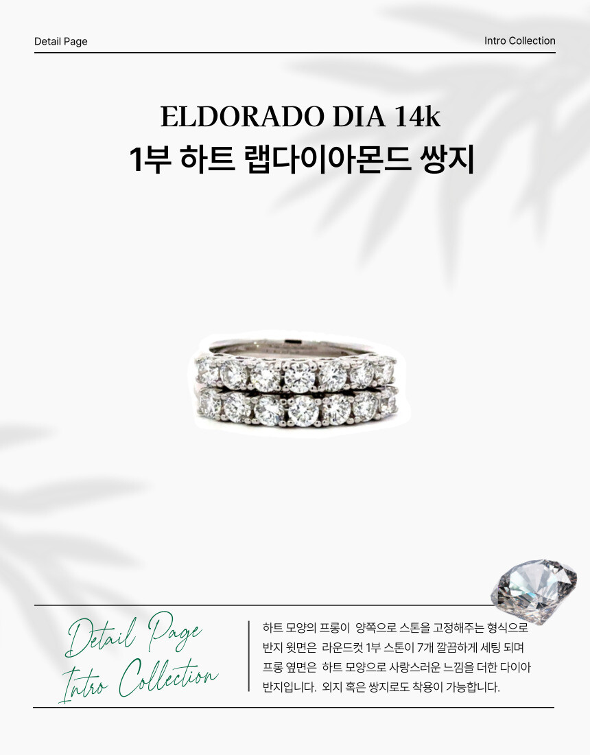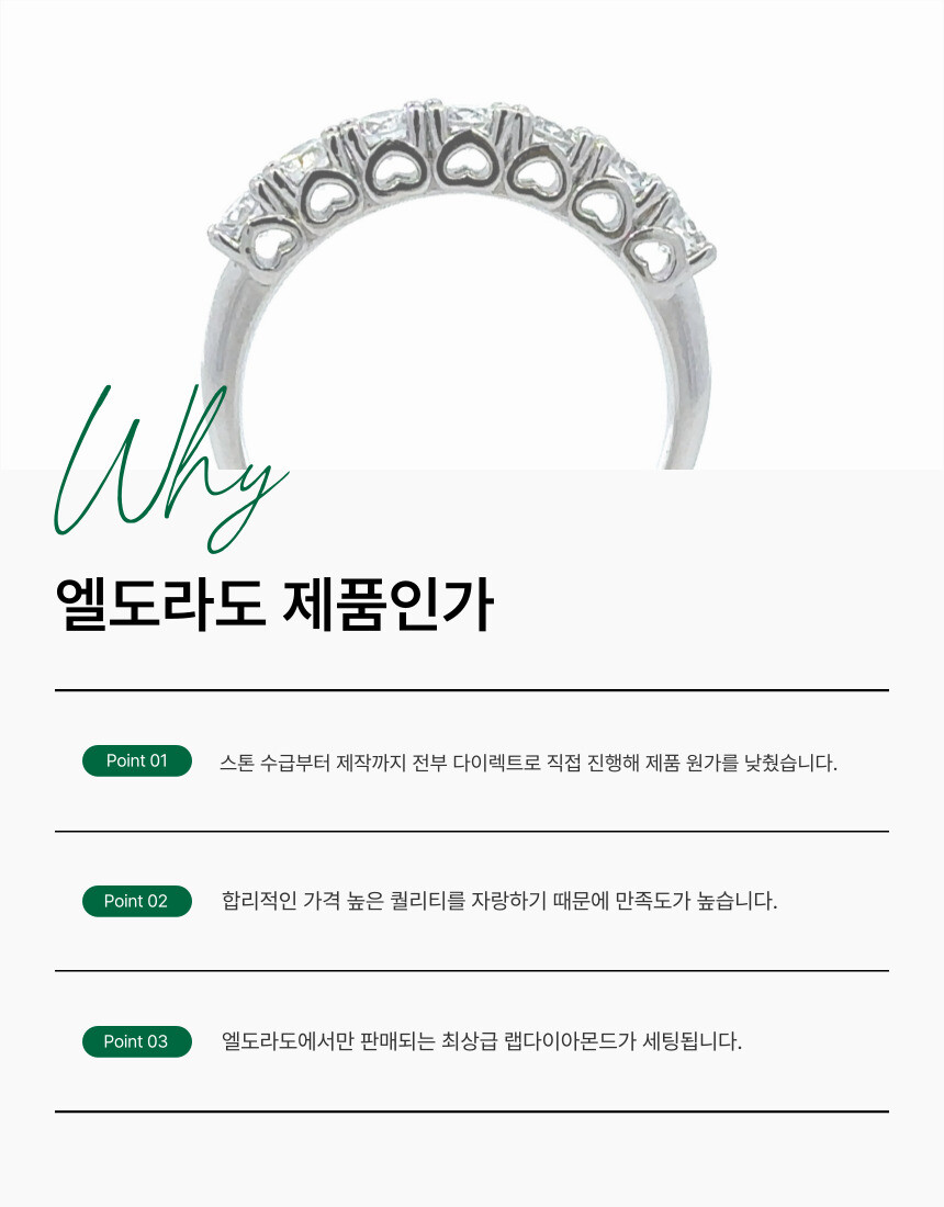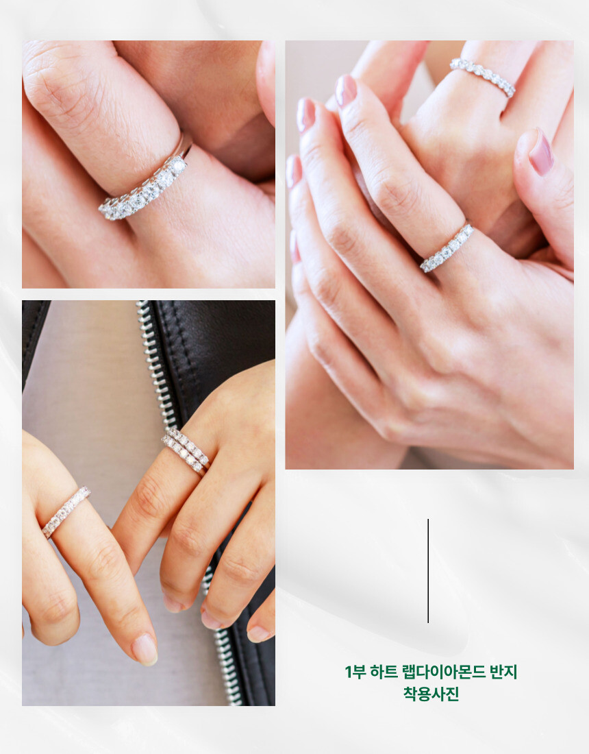 하트 모양의 프롱이 양쪽으로 스톤을 고정해주는 형식으로 반지 윗면은 라운드컷 1부 스톤이 7개 깔끔하게 세팅 되며 프롱 옆면은 하트 모양으로 사랑스러운 느낌을 더한 다이아반지입니다. 외지 혹은 쌍지로 착용이 가능합니다.