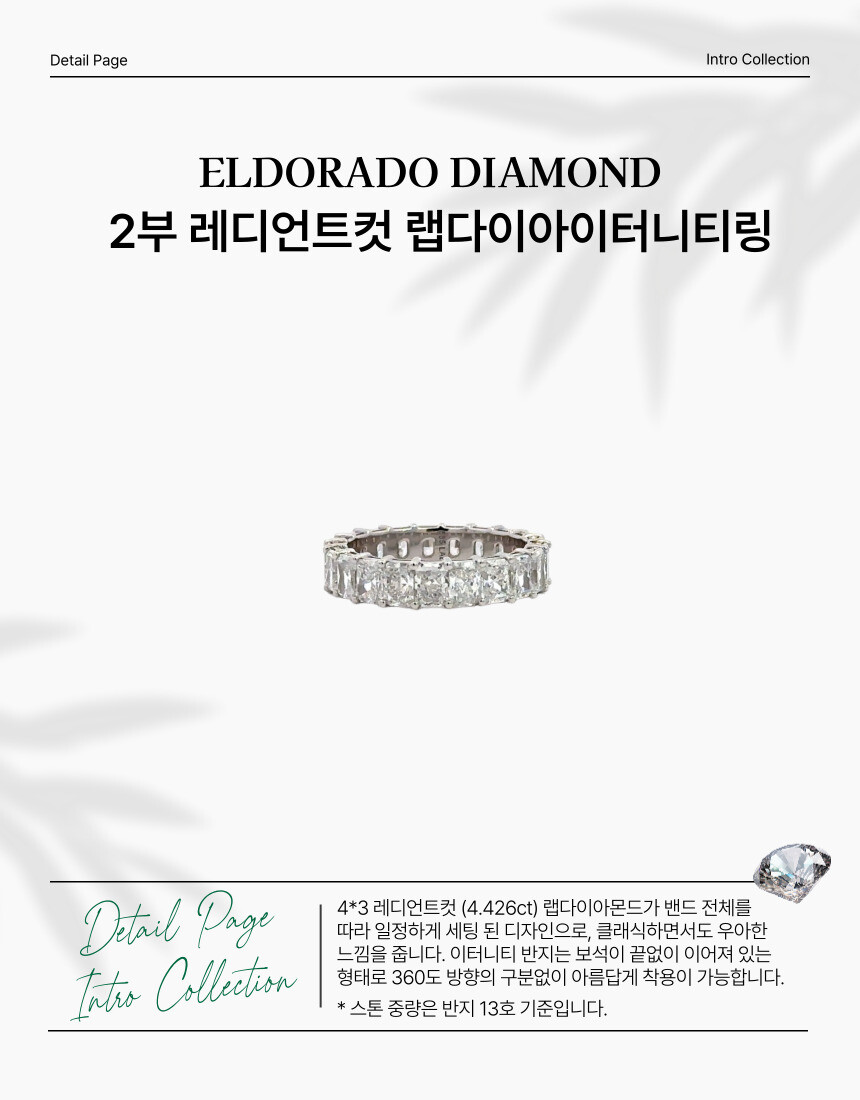4*3 레디언트컷 (4.426ct) 랩다이아몬드가 밴드 전체를 따라 일정하게 세팅 된 디자인으로, 클래식하면서도 우아한 느낌을 줍니다. 이터니티 반지는 보석이 끝없이 이어져 있는 형태로 360도 방향의 구분없이 아름답게 착용이 가능합니다. * 스톤 중량은 반지 13호 기준입니다.