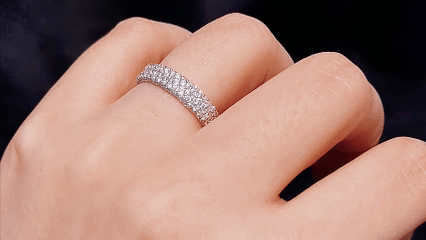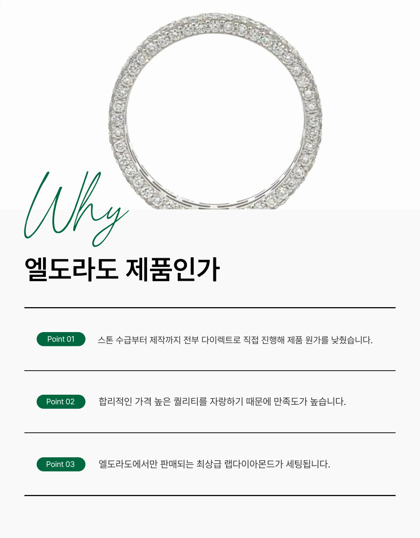 파베 세팅 기법을 이용해, 멜리 사이즈 랩다이아몬드를 링 전체에 촘촘하게 감싸는 방식으로 제작 된 반지입니다. 360도 어느 방향으로 보더라도 반짝임이 살아있는 제품으로 포인트 주얼리로 안성맞춤인 제품입니다.