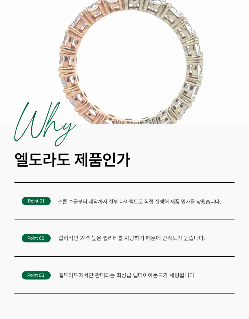 최상급 랩다이아몬드가 원형 링을 따라 부드럽게 연결되어 세팅 된 반지입니다. 골드 컬러가 2가지 믹스되어 반지 윗면 아랫면을 다른 느낌으로 착용하실 수 있습니다. 360도 어느 방향에서도 반짝임을 잃지 않는 반지입니다.