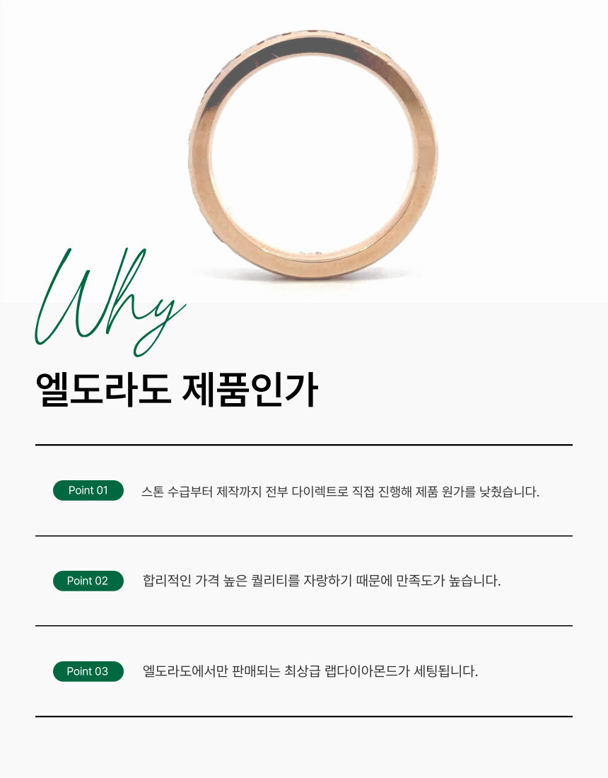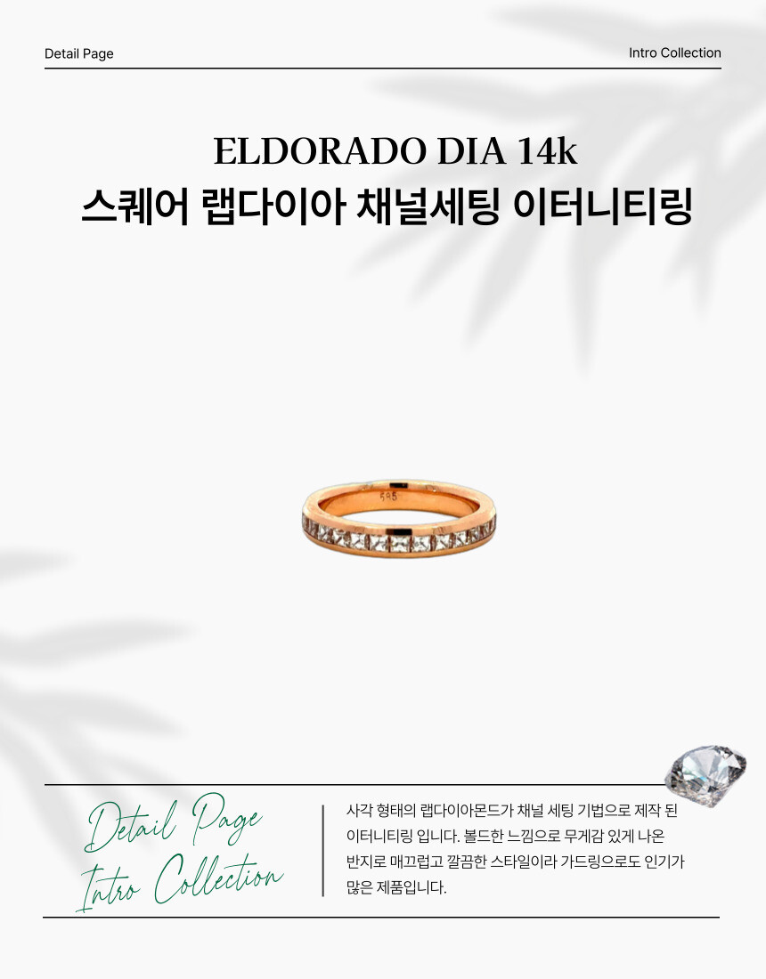 사각 형태의 랩다이아몬드가 채널 세팅 기법으로 제작 된 이터니티링 입니다. 볼드한 느낌으로 무게감 있게 나온 반지로 매끄럽고 깔끔한 스타일이라 가드링으로도 인기가 많은 제품입니다.
