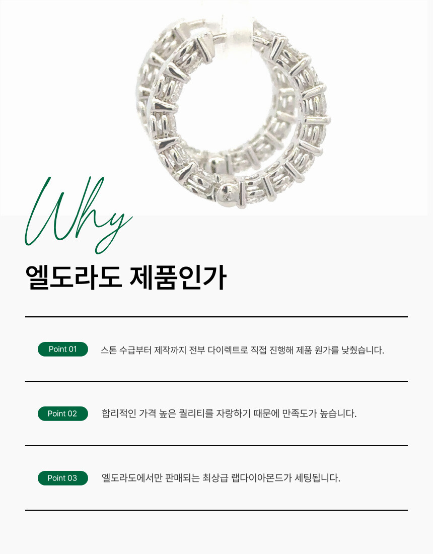 랩다이아몬드를 후프 뒷면의 안쪽에 세팅하여 착용시 빛 반사를 극대화 하였습니다. 전면에 7개, 뒷면 안쪽에 5개 총 12개 스톤이 한쌍으로 세팅되어 어떠한 각도에서도 빛을 잃지 않는 후프 이어링입니다.