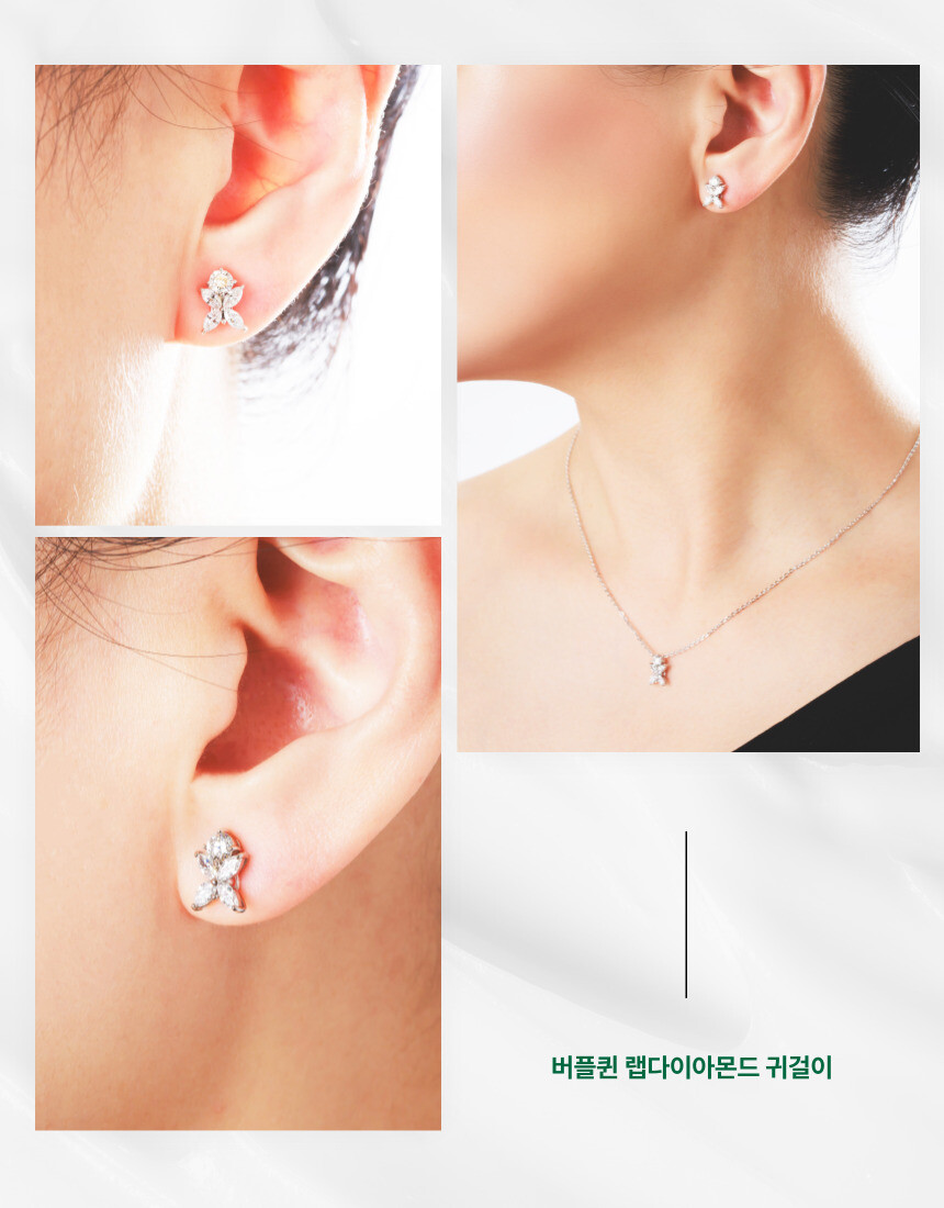 버플퀸 테니스팔찌와 세트로 출시 된 랩다이아몬드 귀걸이입니다. 최상급 마퀴즈컷 스톤과 라운드컷 스톤을 나비 모양으로 믹스매치해 귀걸이로 제작 했습니다. 우아하면서도 사랑스러운