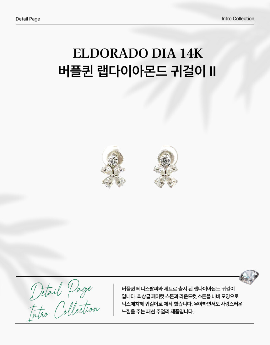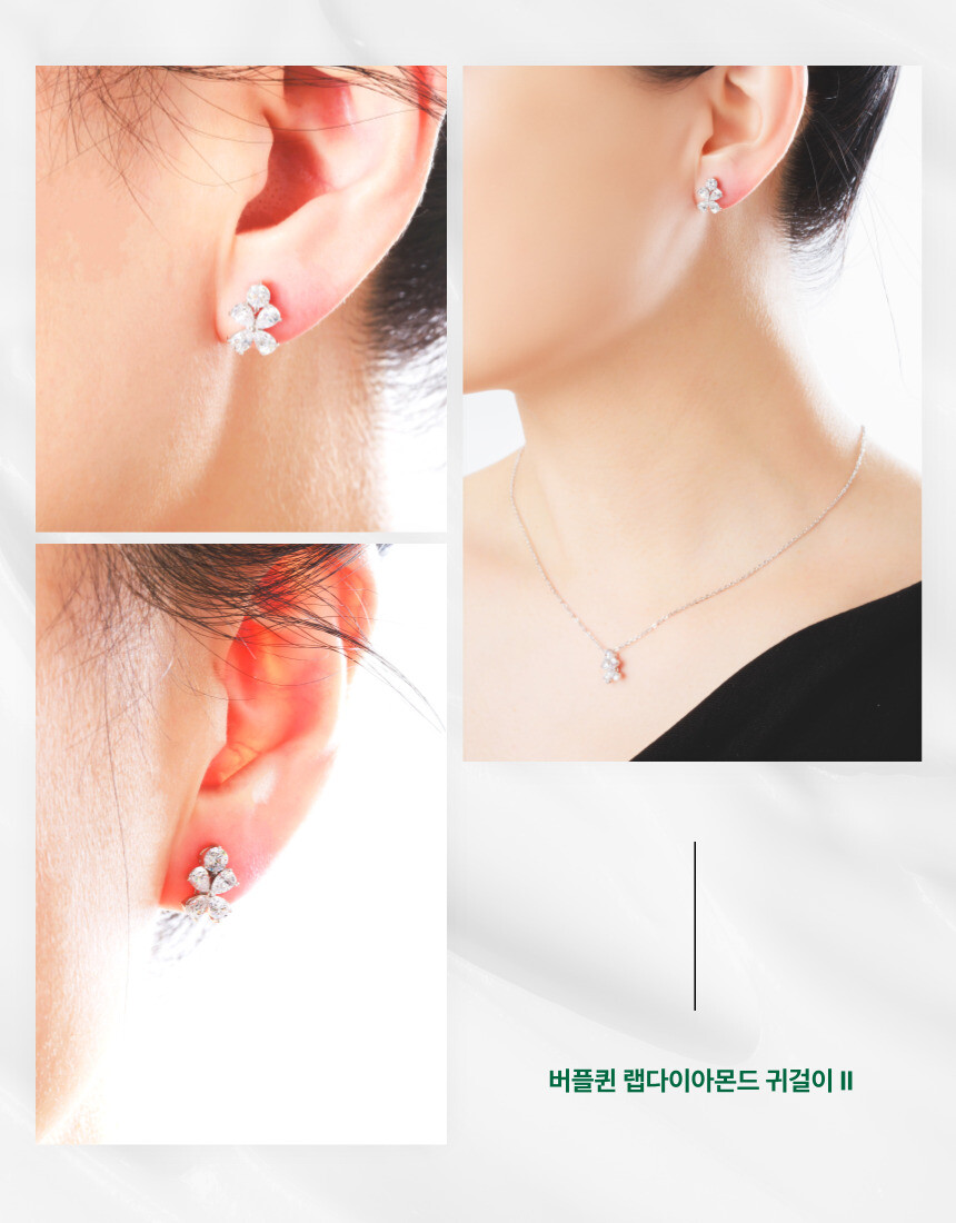 버플퀸 테니스팔찌와 세트로 출시 된 랩다이아몬드 귀걸이 입니다. 최상급 페어컷 스톤과 라운드컷 스톤을 나비 모양으로 믹스매치해 귀걸이로 제작 했습니다. 우아하면서도 사랑스러운 느낌을 주는 패션 주얼리 제품입니다.